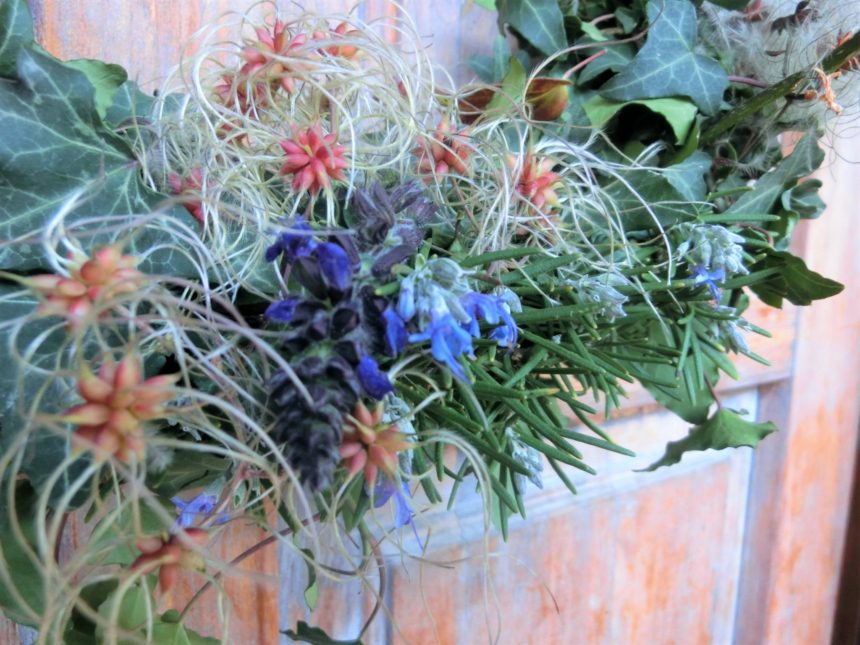 クリスマスだから!と赤い実を使いたくなるのを抑え、赤いのはシュシュっとなってる植物とその紅葉だけで。あとは休暇の家にあったまだ色鮮やかな花の部分と、ローズマリーの花、どちらも青系で、シックな仕上がり・・・まだまだ改善の余地もあるとは思うけど、この2年から比べると凝ったリースにかなり満足しています。