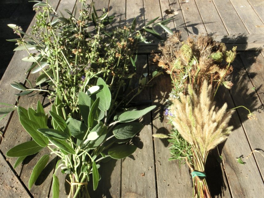 リースには先っぽしか使わなかった段々に花が咲いていたもの、こちらはオリーブ&セージのハーブを合わせて・・・もう6月のスワッグでリビングはいっぱいなので、キッチンに近い壁に。こちらも赤いリボン付きで。