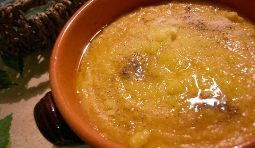 6. 茹でた豆類と4.をPASSATUTTO(パッサ・トゥット=全部通す、イタリアでは一家に一台ある濾し器)でつぶす。パサパサで通しにくくなってきたら茹で汁を加えながら行う。