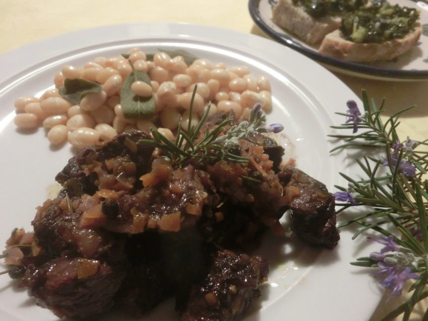 こちらは名古屋のオステリア・モカイオさん(フェイスブック公式ページ)。いろんなお肉を使われているのですが、これは鹿肉!の骨つきです。付け合わせはトスカーナ付け合わせの王道・白いんげん豆です。
