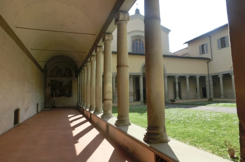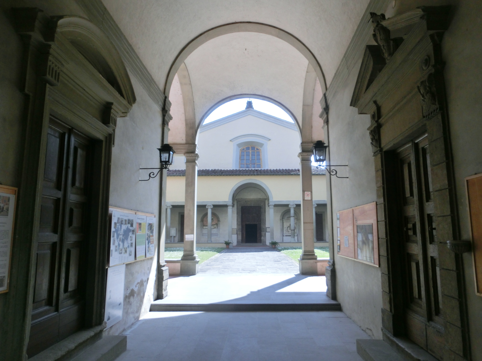 この中へ入ると柱廊に囲まれた真四角の小さな中庭があり、天気のいい日には格好の癒しスポットになっています。私が行った時はトスカーナはレッドゾーンでしたが、おそらく近所に住んでいる女性とそのお孫さんが、小さな花を摘んでなごんでいました。