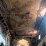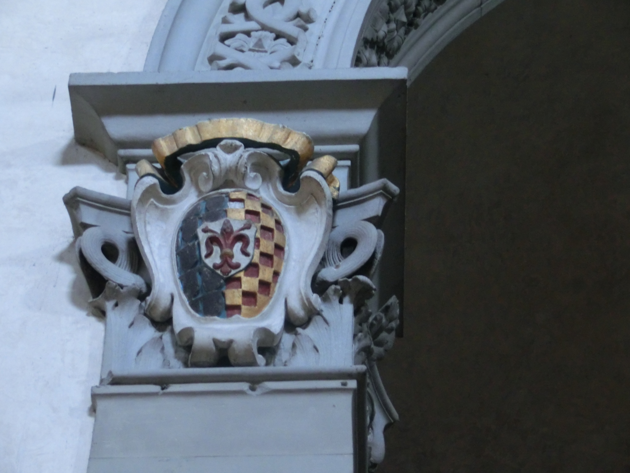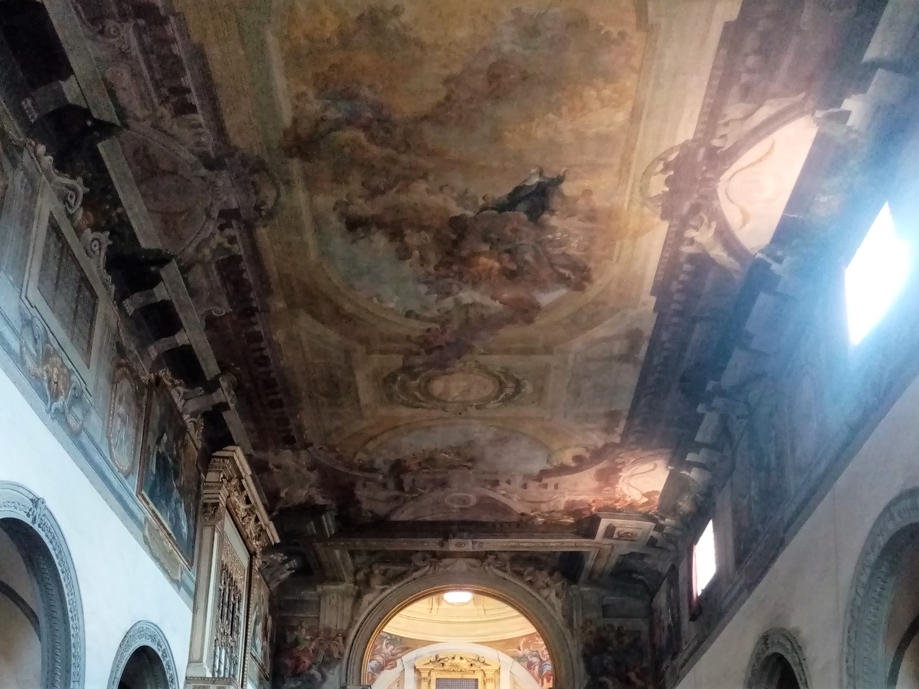 教会の建設は1257年、当初はベネディクト派の教会でしたが、やがてシトー派、その後はカルメル会の修道院となり、1928年にはフランスのアゴスティーニ会のものとなります。現在見られる教会は1400年代後半の改修のもので、天井画は1660~70年に描かれたヤコポ・キアヴィステッリによる「聖女の功績」です。左右は3つづつの礼拝堂となっており、アーチ横にはこの教会を保護していた家紋が見られます。