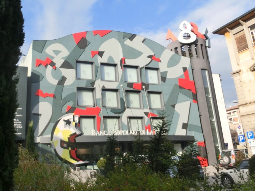 1884年創業の歴史ある銀行で、支店もピサ県を中心に18支店。このポンテデーラ支店がいつできたかは分かりませんが、かつての映画館をラヤーティコ出身の建築家アルベルト・バルタリーニ、アーティストのウーゴ・ネスポロを起用して立て替えました。銀行だけに数字のモチーフですが、堅苦しい印象はなく、カラフルで見ているだけで楽しくなるような建物です。これは外装だけでもなく、内装も。なんだか行きたくなる銀行です(銀行サイトには、内部の写真も掲載されています)。