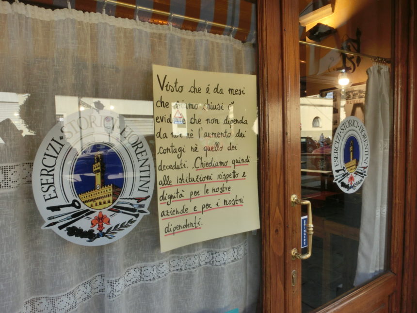 なんとかイエローゾーンでとどまっているトスカーナ。とはいえ、春のロックダウン、そして秋から今までの開けたり閉めたり、特にクリスマスシーズンの完全クローズなど、稼ぎ時に大きな打撃を受けた飲食業界(もちろん飲食業界だけではありませんが)。本当に、町を歩いているだけで閉ざされた扉に、人数制限やルールが書かれた張り紙に、そして完全に閉店してしまった店に、悲しさとやるせなさと憤りを感じています(私の個人的な意見です)。TOP写真は、先日フィレンツェに行ったときに、たまたま通った老舗のレストランに貼られていた張り紙。