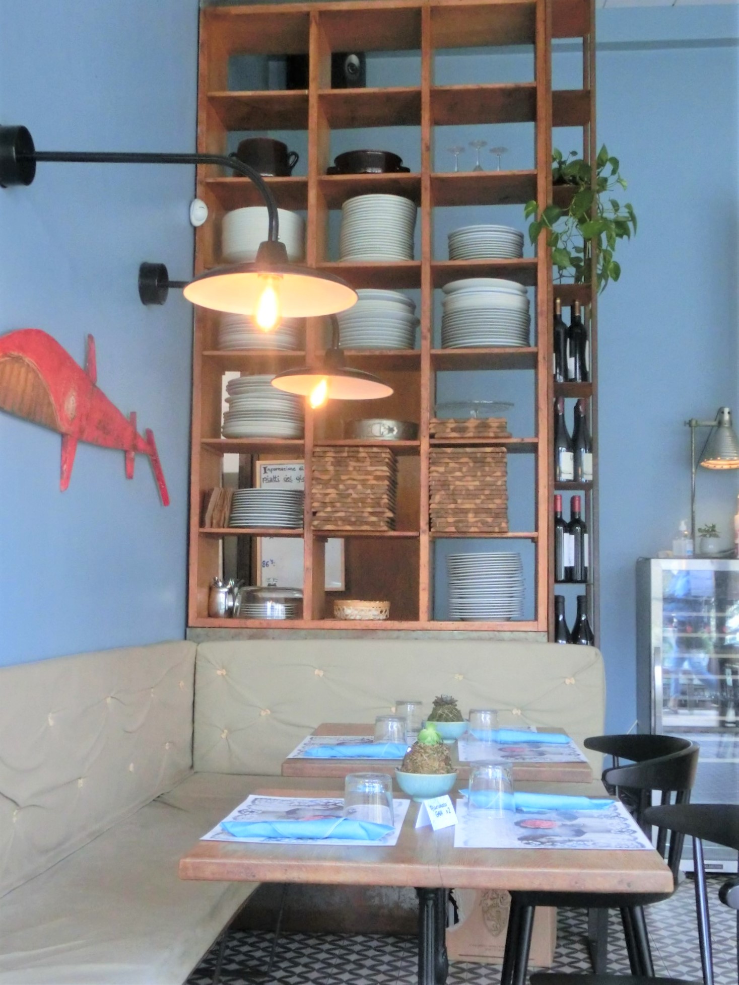 こちらは水色を基調にした落ち着いた空間で、私のように1人ランチしている人も多かったです。メニューは多くないですが、ザ・トスカーナの料理はほとんどありません。ランチはパスタやリゾット、ファラフェルやクラブサンドイッチ、マグロのタリアータ・醤油ソースなど、外国っぽい料理もあります。私は「本日のメニュー」から、ボッタルガのタリオリーニを。味はとっても美味しいですが、ポーションは少な目でお値段はやや高め。私は水、パスタ、エスプレッソで15ユーロでした。食事がメインの目的でなく、ゆっくりと落ち着きたい1人ランチとか、久しぶりの友人たちとおしゃべりを楽しむなど、雰囲気や居心地目的で来るのが良いですね。今回はランチできましたが、通常なら朝から夜まで毎日オープン。食事以外のカフェ、おやつタイム、アぺリ、夕食後のもう1軒でも使えるので、楽しみ方は様々です。
