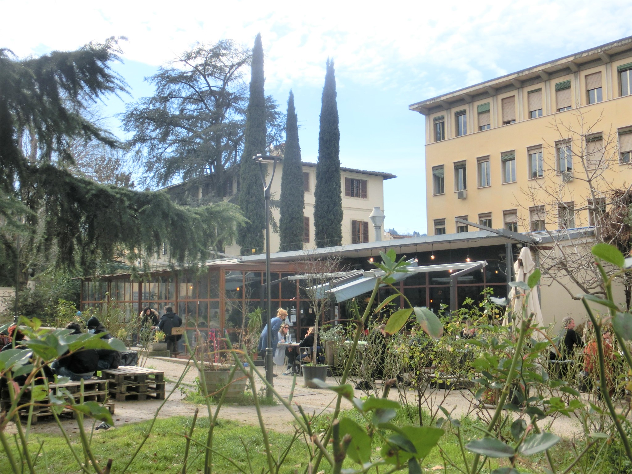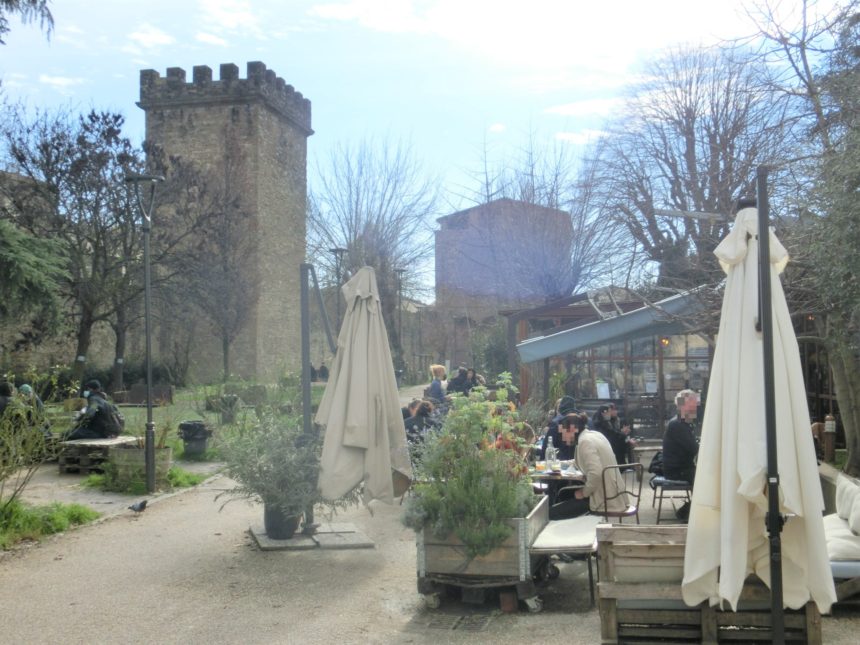 TOP写真のように店の前には市外壁がそびえ、その中の市営公園の中にあるカジュアルな解放感いっぱいのお店。今はコロナだし、冬だし、それほど多くの人はいませんでしたが、通常ならきっと多くのフィレンツェ市民が足を運んでそうな感じ。別々の入口から入る2ホールがドリンク提供のカウンターでつながっています。上の写真はカウンターがある左側のホールで、カフェ利用のみっぽかったので、右側のホールに移動しました。