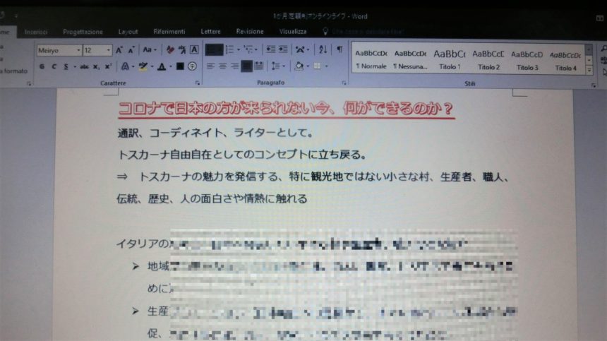 残念ながら、コロナもまだまだ収束しそうにない。日本の方に来ていただける日はまだまだ遠い。私もライターやリサーチなどで細々と仕事をしていますが、やっぱり、リアルというか、人と触れ合うというか、そういう仕事が好きなんですね。もちろん日本からは来られないので全くのリアルではないのですが、オンラインで何かやりたいと思っています。有料になりますが、その分しっかりと計画を立てて、イタリアの組織や人も巻き込んで。私はガイドではないので、いわゆる「オンライン観光ツアー」ではなく、トスカーナ自由自在の原点にしっかりと足をつけたコンテンツにしたい・・・近々ご紹介できると思いますので、気になる方は楽しみにしていてください!