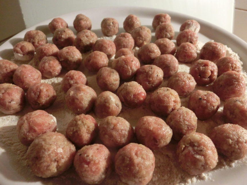 2)直径2㎝くらいのボール状にし、小麦粉をしいたお皿でまぶす