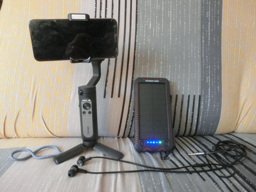続いて心配になったのが、果たしてスマホのバッテリーは持つのか?ローマツアーではスマホをネットにつなぐだけだったけど、今回は更にジンバルへの接続とライブスタジオシステム?Streamyard にもつなぐし、更に田舎で電波弱い分、電力消費するのでは・・・?と、何回かテストをしたら、だいたい15分で20%消費=1時間15分でゼロ?ということはライブ1回でギリギリ!かなり怖いので、今更ながら、購入しました。もっと安いもの軽いのもあったのですが、災害時にも使えるように、太陽光充電もできるタイプで、更に災害時やアウトドアにも役立つ?懐中電灯付き。何回かのリハでは1時間半でも大丈夫でしたが、これもフル充電して装備していきます。