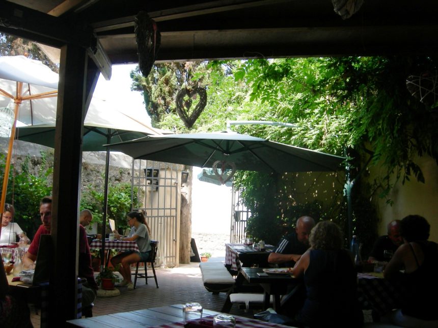 私たちはローマ劇場遺跡沿いの道・Lungo le Mura del Mandorl通りを遺跡を左側に見ながら歩き、下の写真の奥あたり右側に庭側の入り口を見つけて入店しました。