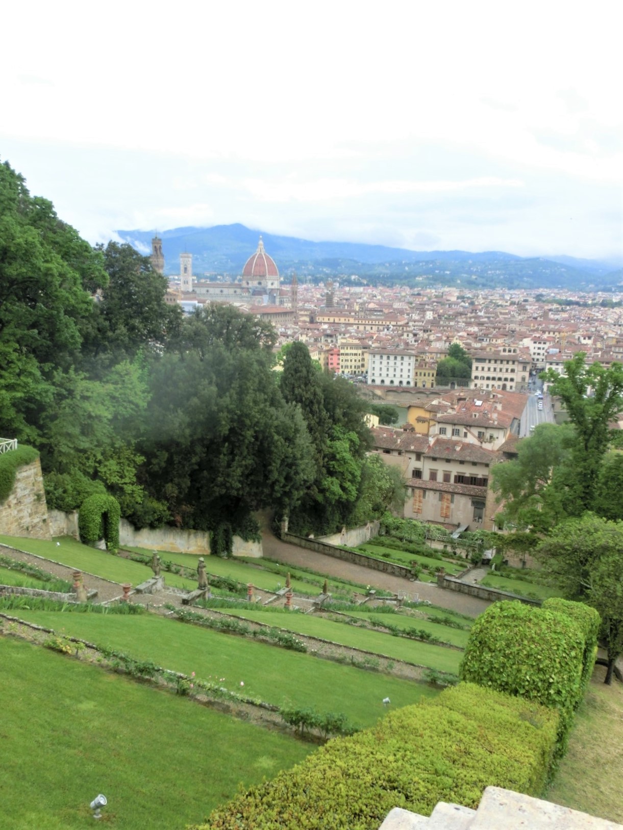 パノラマテラスから藤棚の反対側に下りると、庭園全体を見渡せる場所もあります。カップルにはもってこい?また、現在は休館中(2021年5月6日現在)ですが、ミュージアムにもなっているバルディーニ博物館近くの入口と、ボーボリ庭園への抜け道や、ベルヴェデーレ要塞からも近い上の入口があります。私は下の入口から入り、庭園を1周しましたが、上から下って行ってもいいですね。
