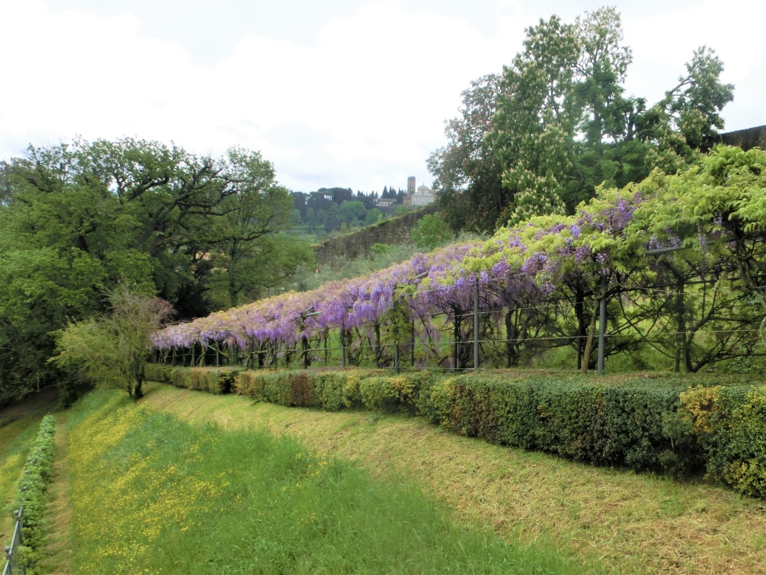 フィレンツェにはピッティ宮殿のボーボリ庭園をはじめ様々な庭園がありますが、藤で有名なのが、このバルディーニ庭園です。オルトラルノ(アルノ川の向こう側)地区、ちょうどグラツィエ橋の南側にあります。私はてっきりバルディーニ博物館とくっついている庭園かと思っていたのですが、それとはまた別。入口はバルディ通りと、ベルヴェデーレ要塞近くのコスタ・サン・ジョルジョ通りの2か所にあります。チケットはボーボリ庭園と陶器博物館との共通チケットになっており、後者の入口はボーボリ庭園の上の入口とつながる抜け道があります。