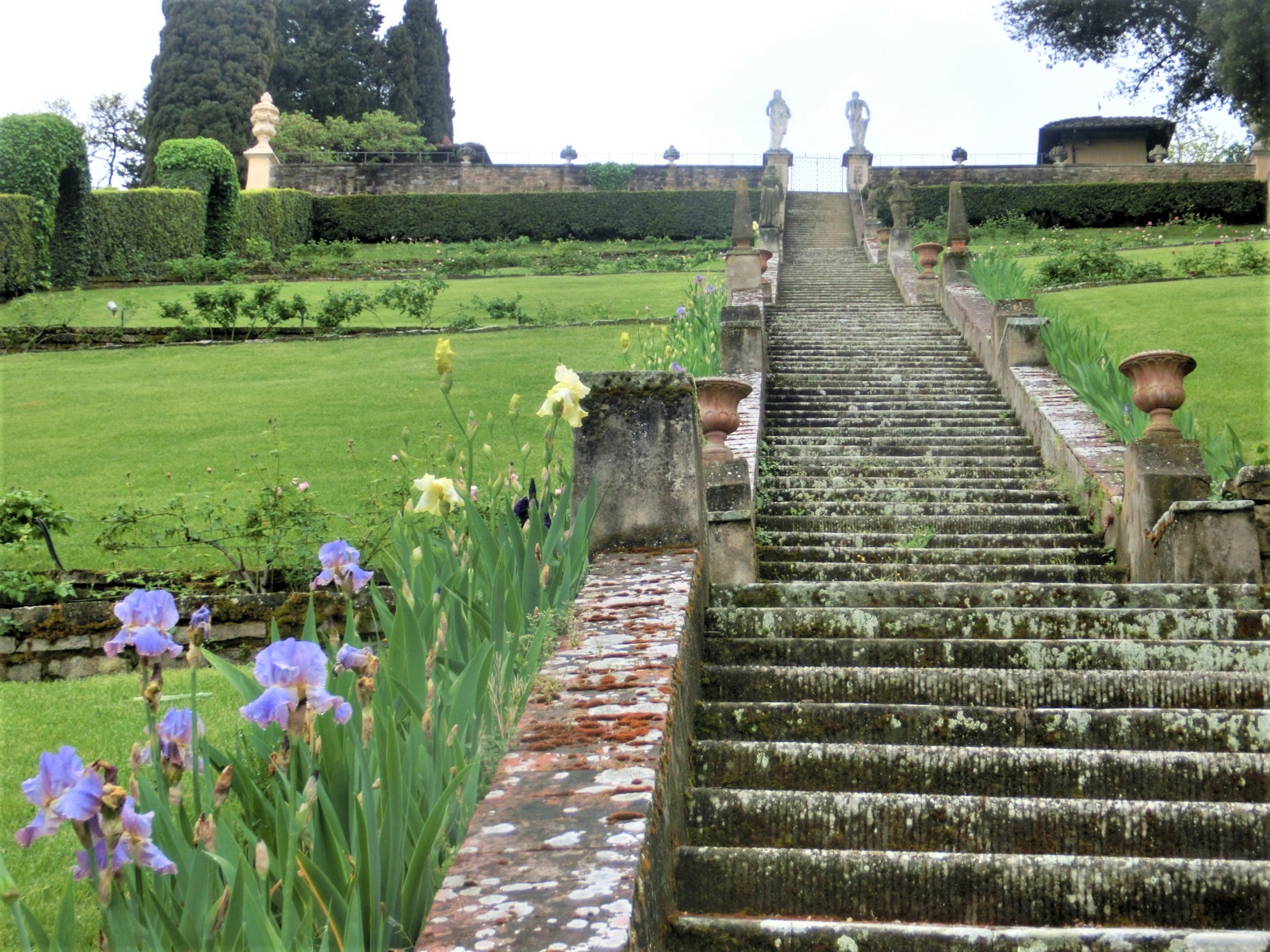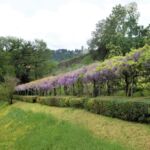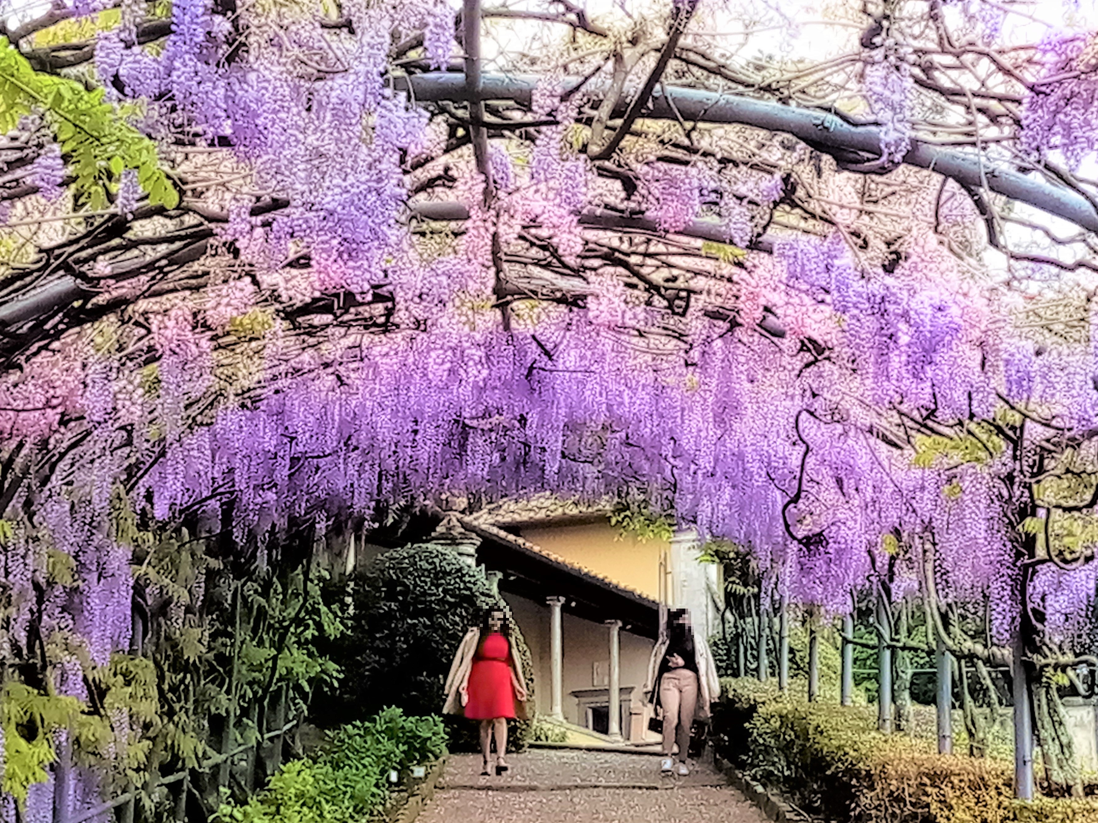 天気のせいで写真はいまいちですが・・・それでも美しい藤にうっとり。藤は1700年代にイタリアに入ってきましたが、早く成長し、開いている場所を埋め尽くすように伸びていく様子が、人間の知識の発達と似ていることから、そのシンボルとされているそうです。この庭園にいつ植えられたかは分かりませんが、網目のようにめぐらされた枝と、そこにたわわになる花は圧巻。それが約40mも続いているのですから・・・
