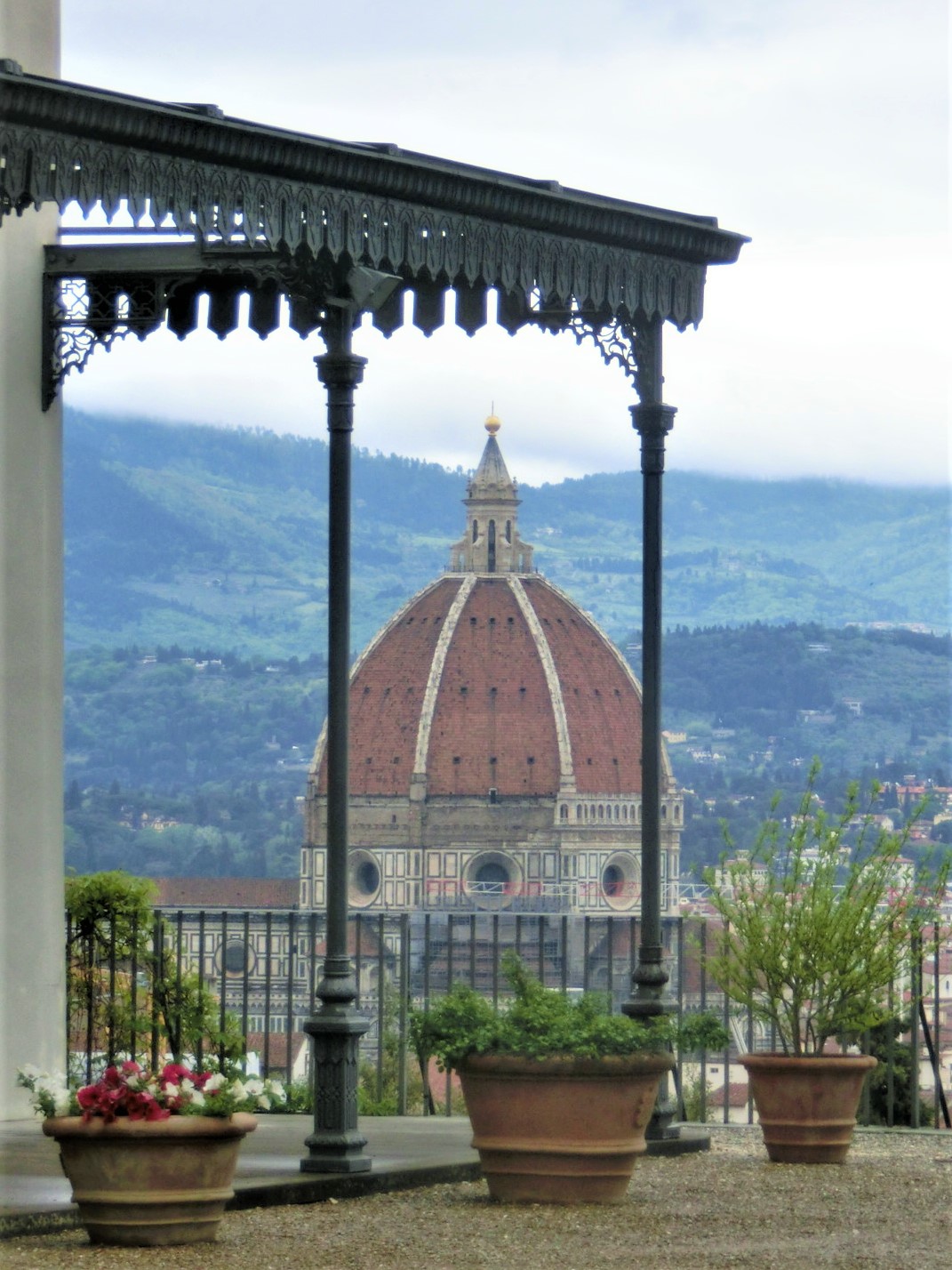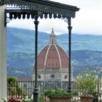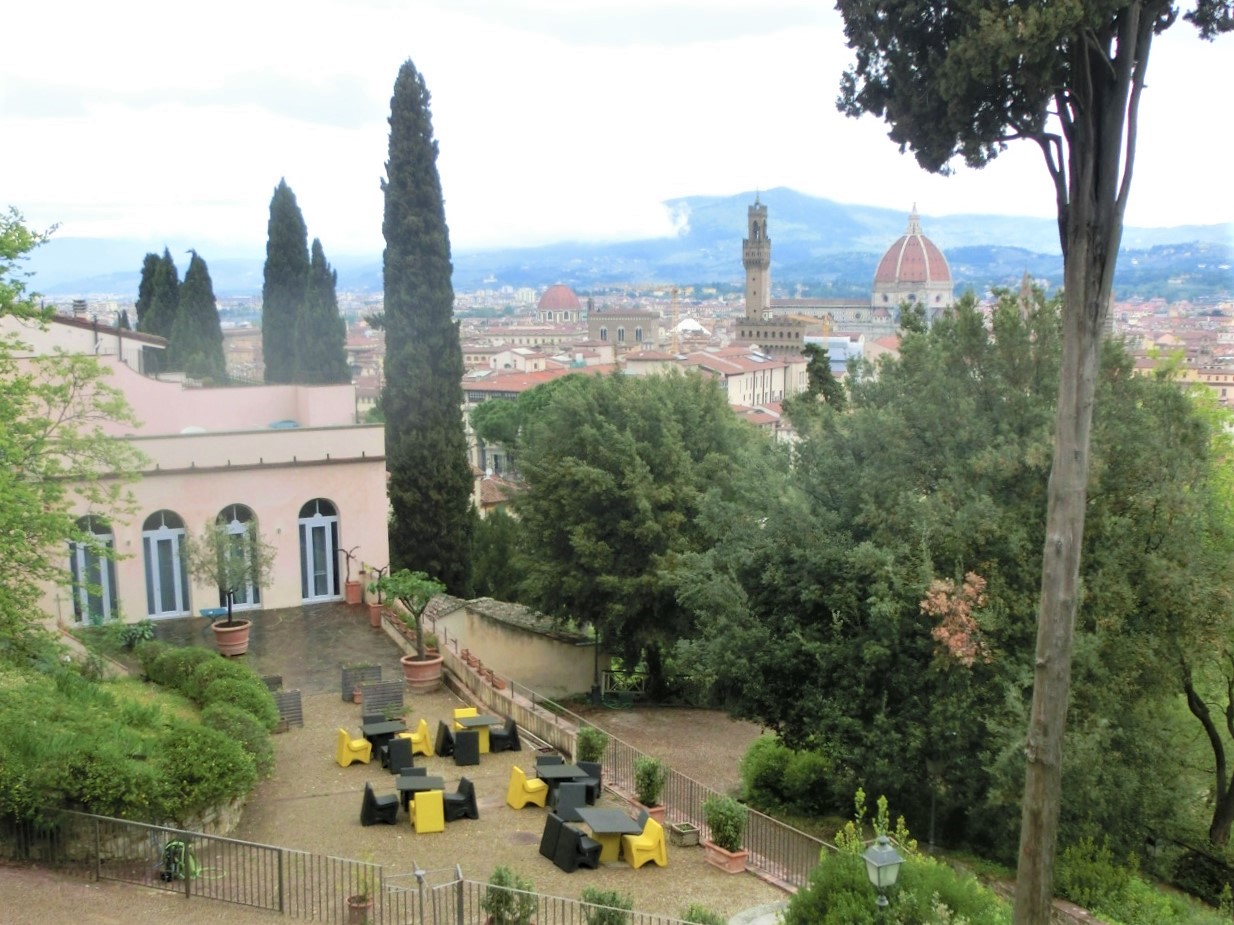 藤棚を上り切るとパノラマテラスに出ます。ここから真下にバロック階段の庭、右前方にはサンタクローチェ地区が見られます。この時はコロナの影響でしまってましたが、休憩ができるカフェテラスもあります。