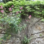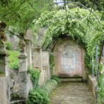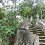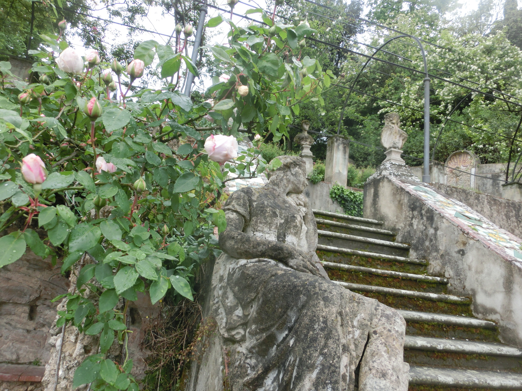 そこから右側の気に囲まれた道を行くと、前左には小さな洞窟と、彫刻に囲まれた小階段。その右側には小さなバラ棚もあります。上に上ると、秋・夏・春の花壇を右に見ながら更に続く階段をゆき、前述の大階段の下までたどり着きます。
