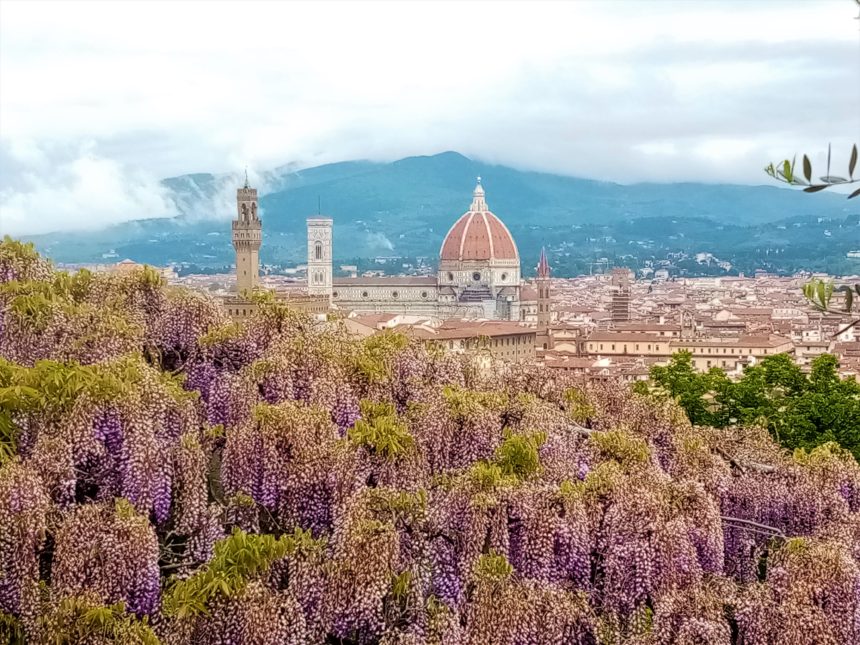 下りながら見つけたもう1つのパノラマは、藤棚が下、城壁が真ん中、上にサン・ミニアート・アル・モンテ教会。