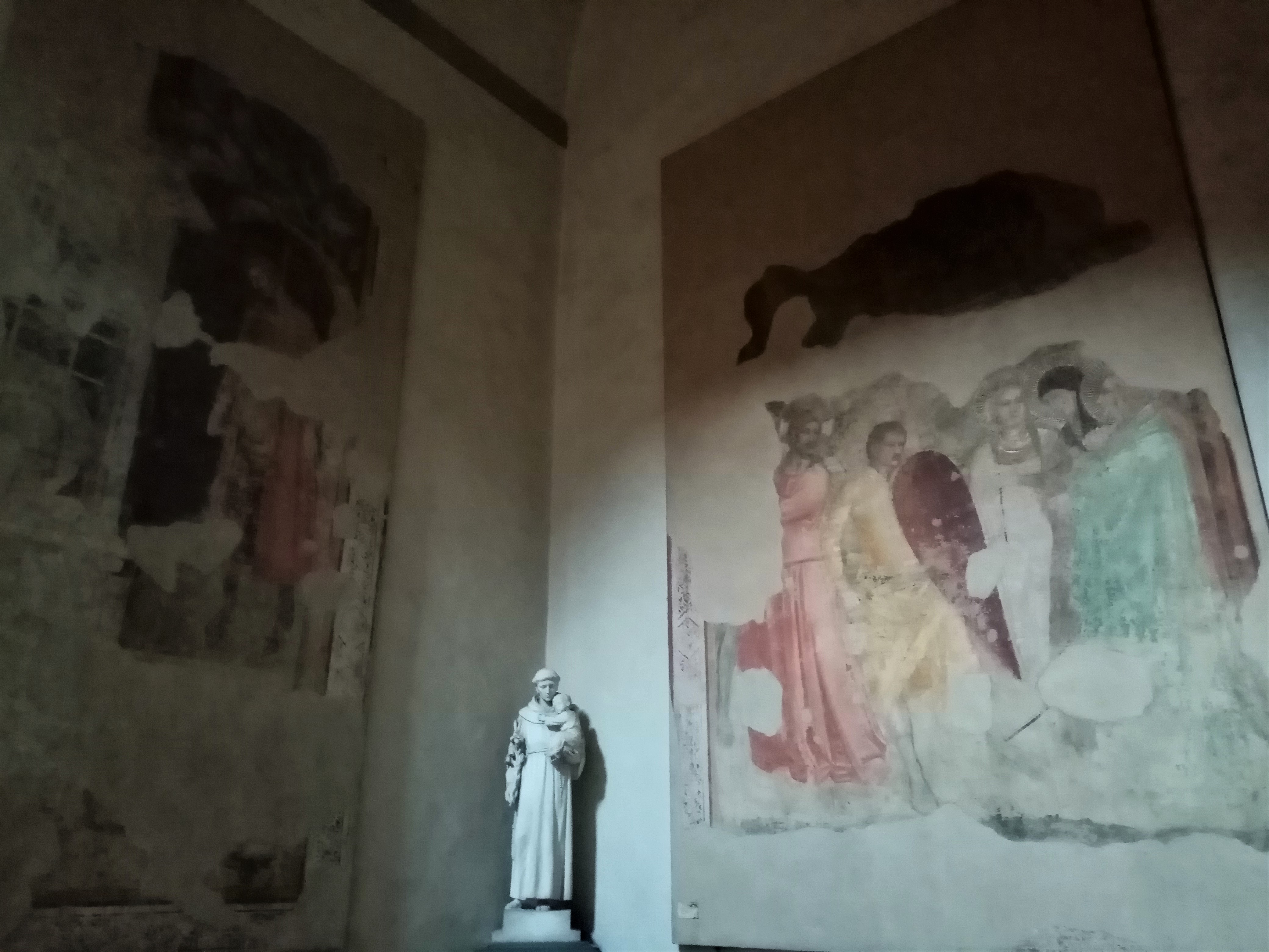 まずは入ってすぐ、左理側の壁にあるのが、フィリッピーノ・リッピの1482~86年の作品「聖ベルナルドの前に現われた聖母」。フィレンツェ包囲の際に作品を守るため、1530年にこの教会に持ち込まれたそうです。そしてもう少し先の同じく左側壁面、ウーゴ・ディ・トスカーナの上には1568年ジョルジョ・ヴァザーリ作の「聖母被昇天と聖人たち」が。