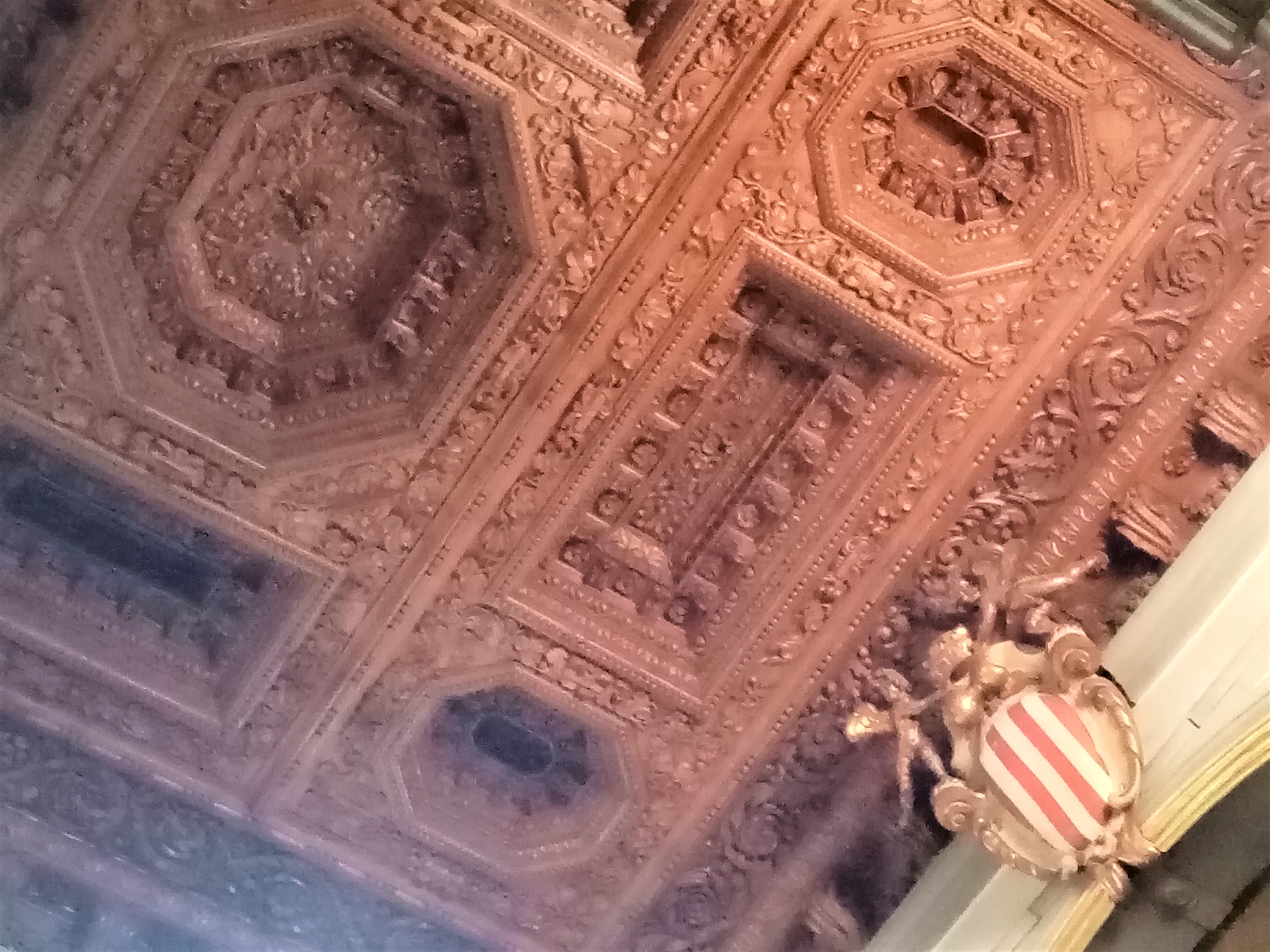 浮彫の木製天井。これは、それまでのゴシック様式の桁組を隠すために1631年までに施されたものですが、とにかく緻密で、首が痛くなるまで見入ってしまいました。間近で見てみたい・・・
