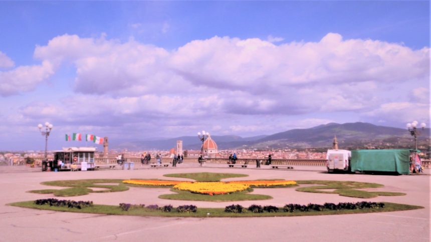 久しぶりに、ミケランジェロ広場へ行きました。私のフィレンツェ好きが決定的になった思い出の場所、やはりいつ行っても良いものです。外国からの観光客もいないし、平日の午前中だったこともあり、昨年のロックダウン明けかのような人の少なさでした。そんな人の少なさを利用してか?広場には植物を使ったこんな展示が・・・フィレンツェの市章の中央にはハチ?