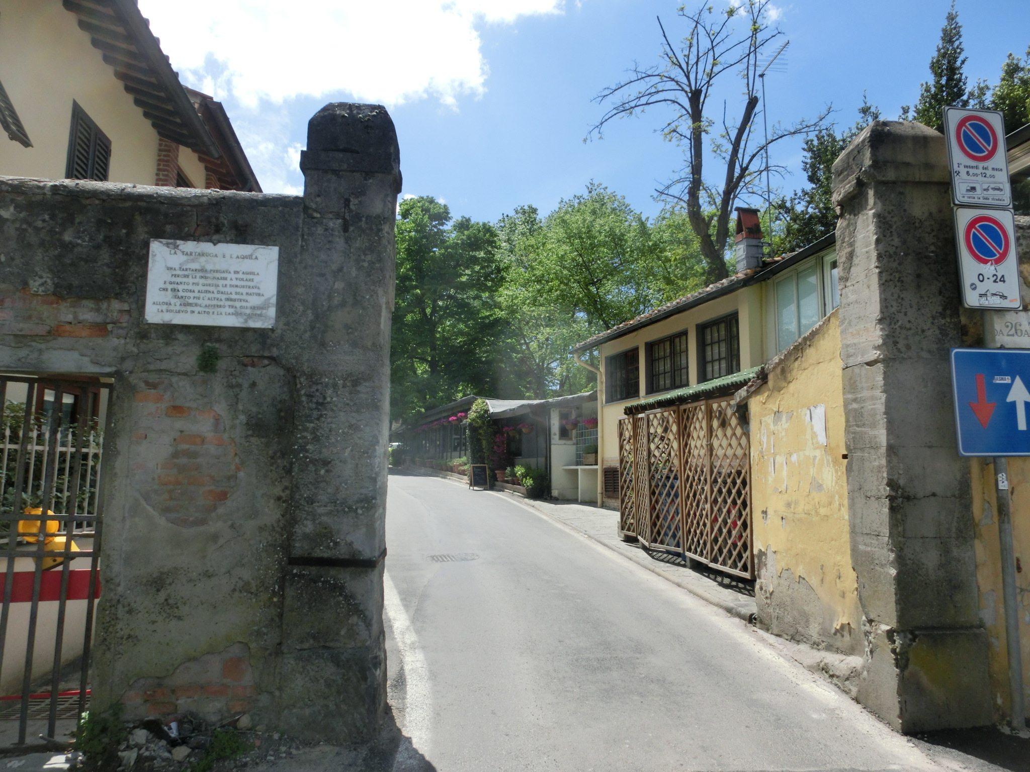 ミケランジェロ広場・バラ庭園を下ったところにある地区が、サン・ニッコロ地区。アルノ川向こう側の地区「オルトラルノ」でも、一番東側にあるエリアになります。昔ながらの職人さんやアーチスト工房などが並ぶ地区ですが、ミケランジェロ広場下というロケーションから、近年はおしゃれなレストランやエノテカ、パニーノ屋さんなども多くできてきました。Osteria Antica Mescita San Niccoloなど、お気に入りのお店もあるのですが、この日はまだ、飲食店は屋外席のみの営業だけ。せっかくだから道沿いではなく、お庭があるようなお店はないかな~と、探して行ったのがこのお店です。お店の名前は、かつて同じオルトラルノのサン・フレディアーノ地区で花屋を営み、皆から愛されていたGiuseppinaさんの愛称にちなんでいます(Beppa Fioraia=花屋のベッパ)。なので、TOP写真のように入口や店内も多くの植物に囲まれています。