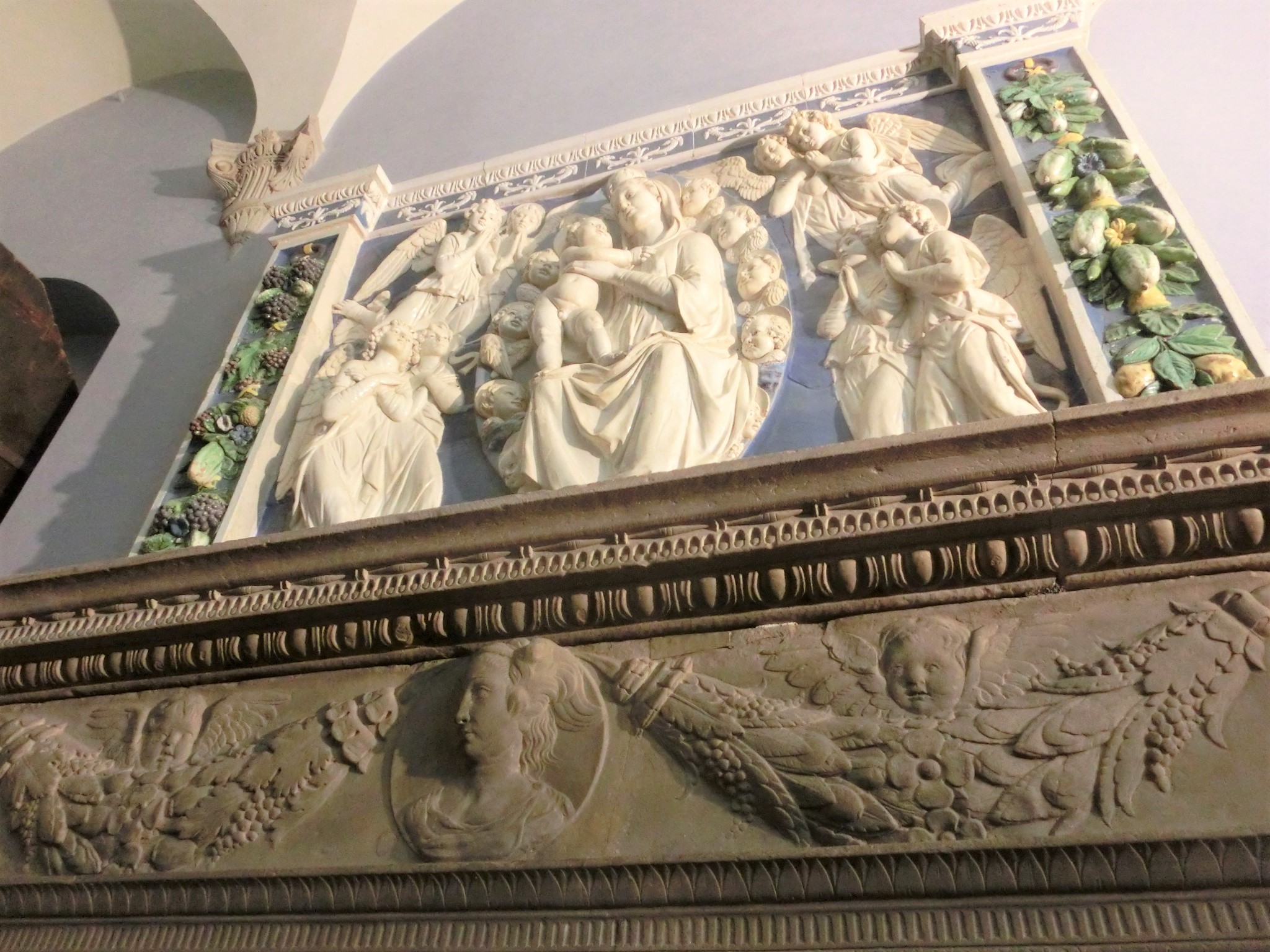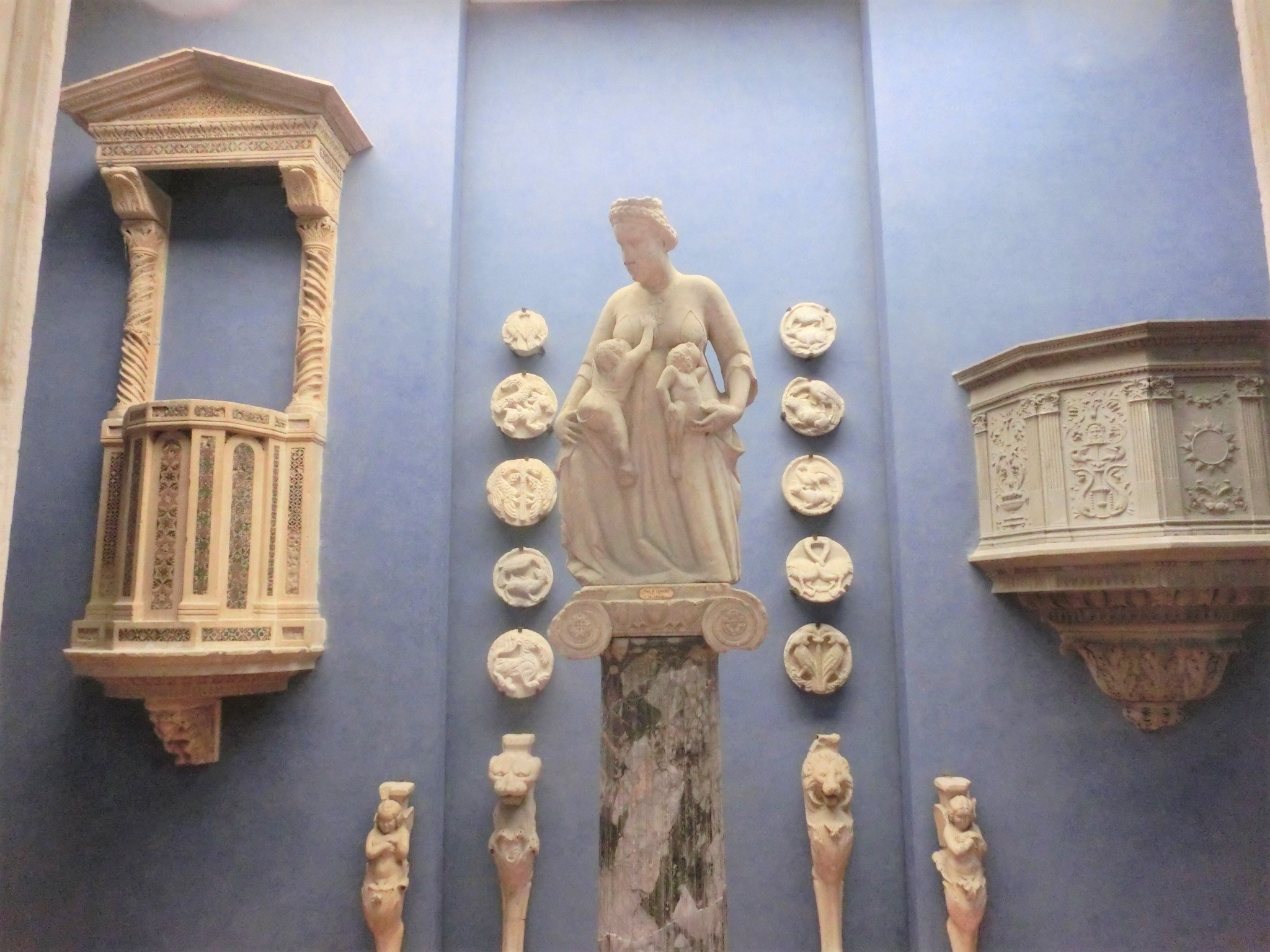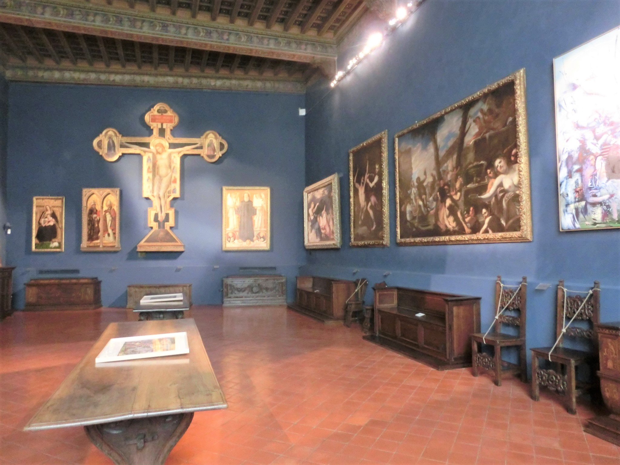 左側の壁には、作者や年代がミックスされた聖母子像がすらり。多くは色彩テラコッタのレリーフですが、レリーフの形に合わせて左右対称にレイアウトされています。そして床面にはカッサパンカ(座面が開いて収納箱を兼ねたベンチ)のコレクション。そすて反対側には・・・