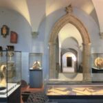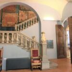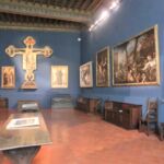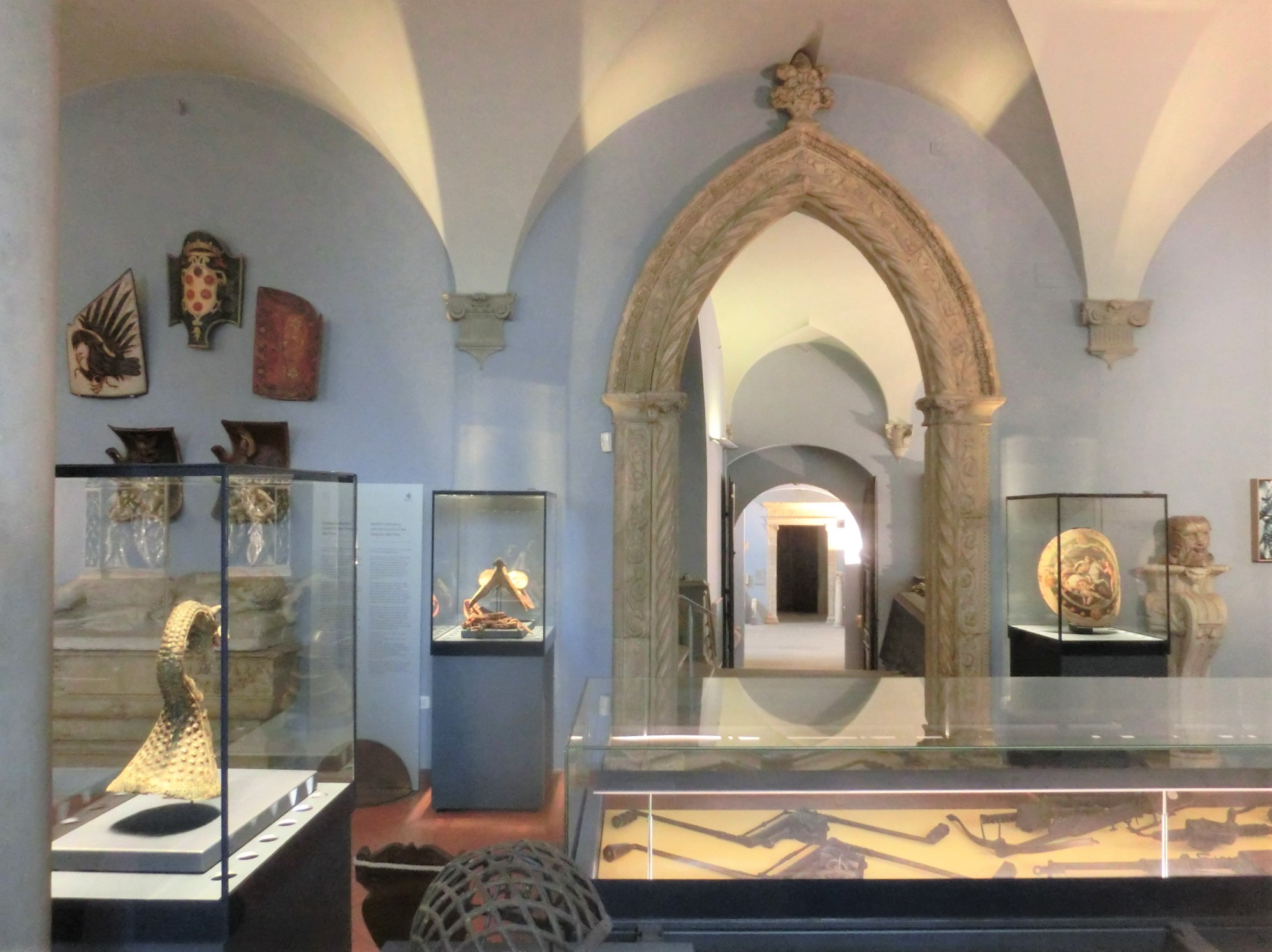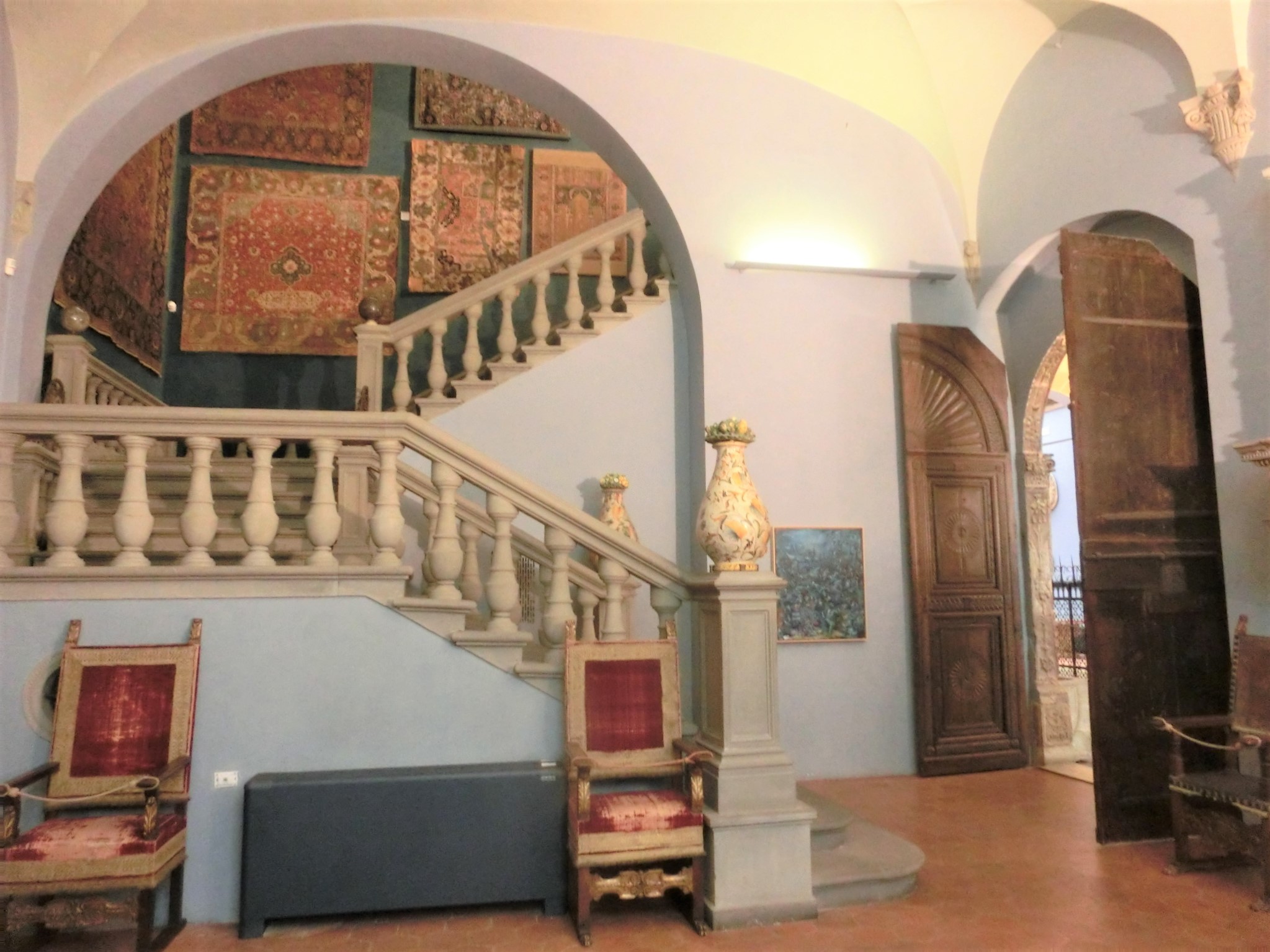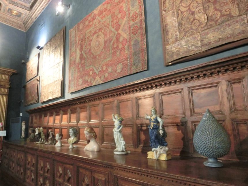 左側の壁には、作者や年代がミックスされた聖母子像がすらり。多くは色彩テラコッタのレリーフですが、レリーフの形に合わせて左右対称にレイアウトされています。そして床面にはカッサパンカ(座面が開いて収納箱を兼ねたベンチ)のコレクション。そすて反対側には・・・
