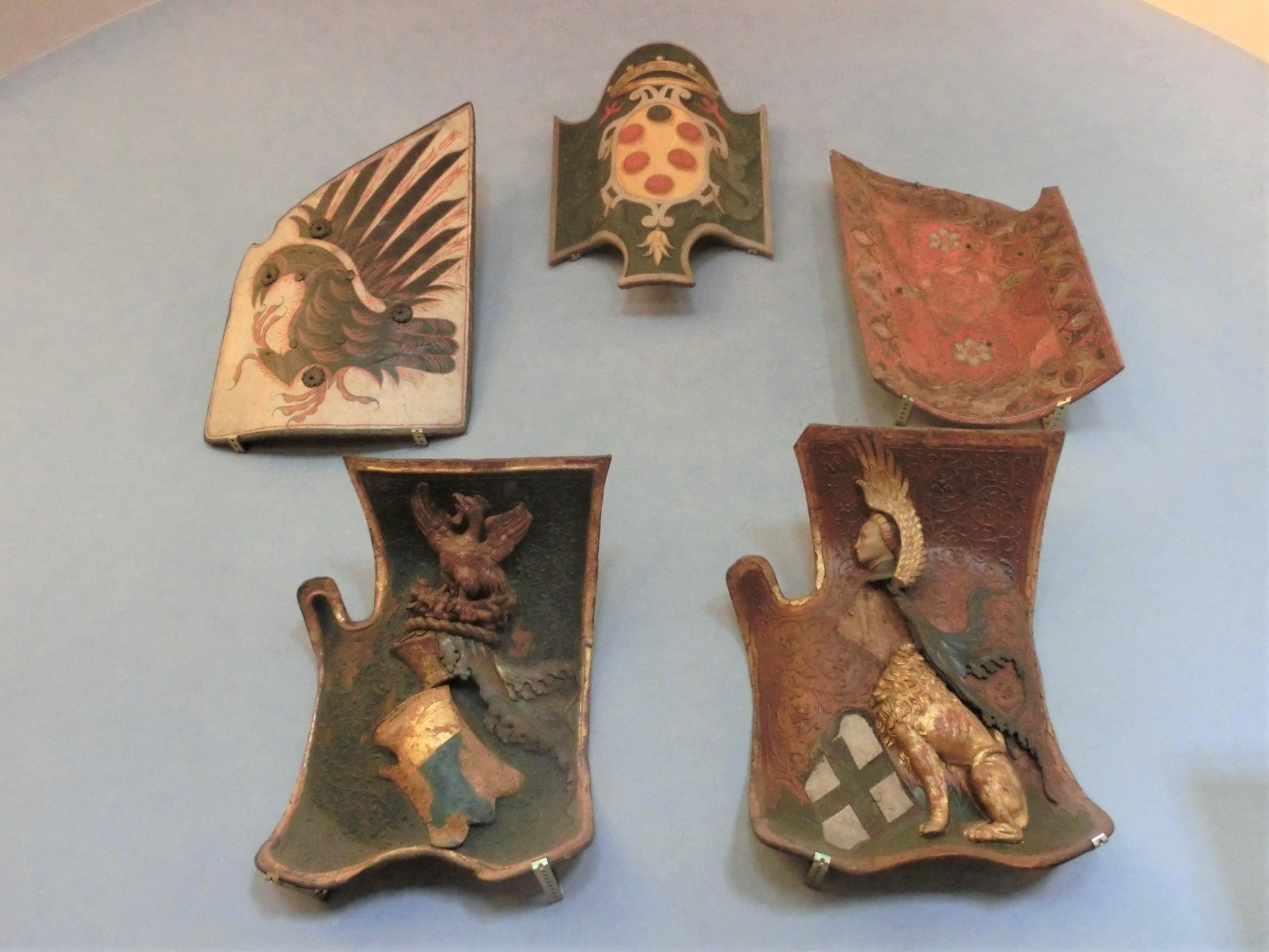 通常の博物館であれば、年代や作者ごとに展示室を構成していきますが、バルディーニはそういったことにはとらわれず、自身のセンスでこの建物全体をコーディネイトしていったのです。こちらは2階にあがるホールですが、ここには数々の紋章が。