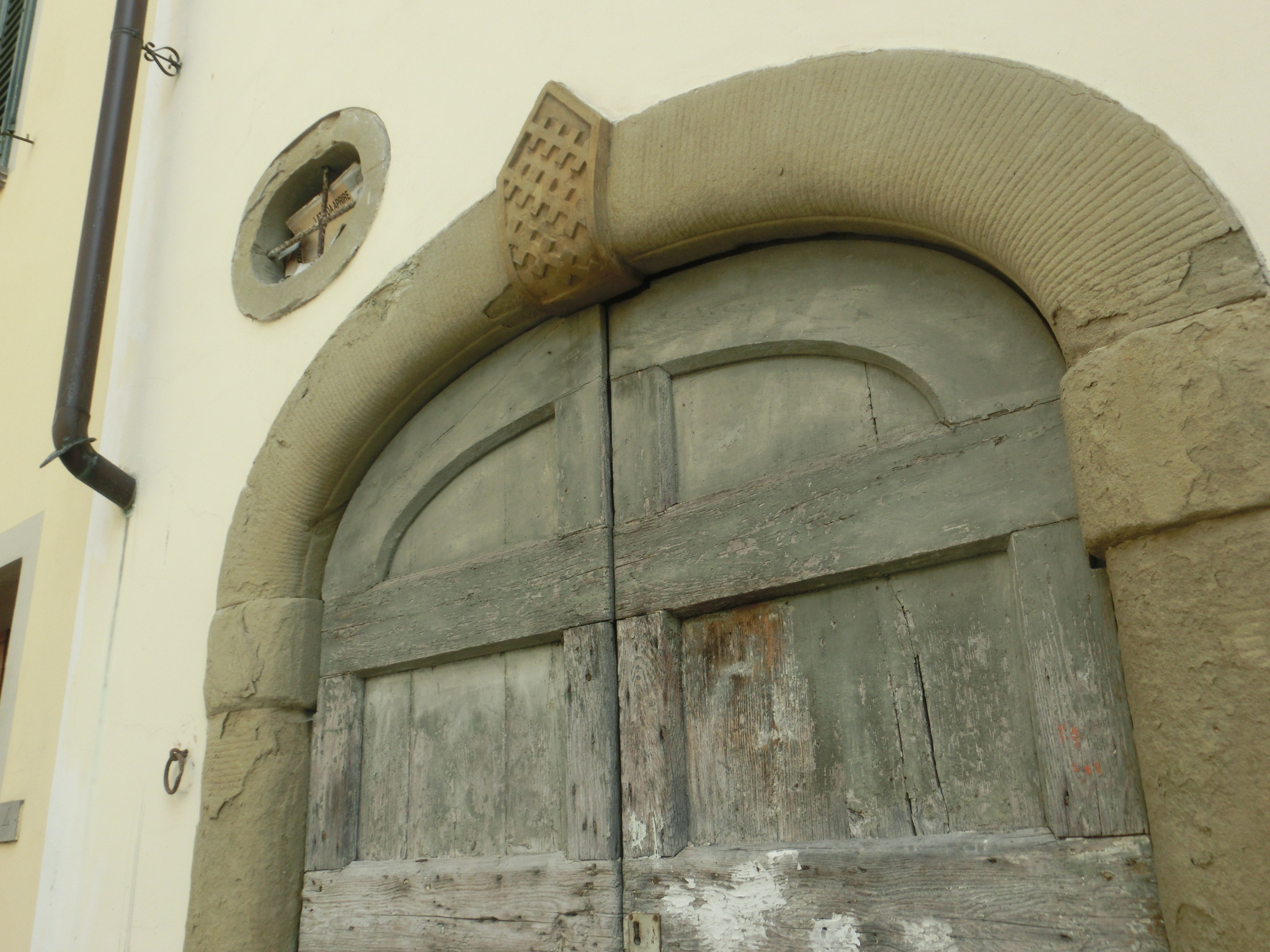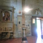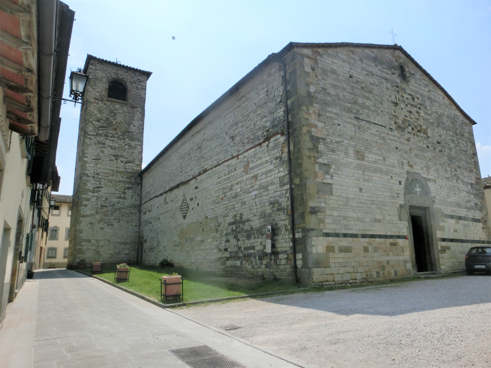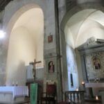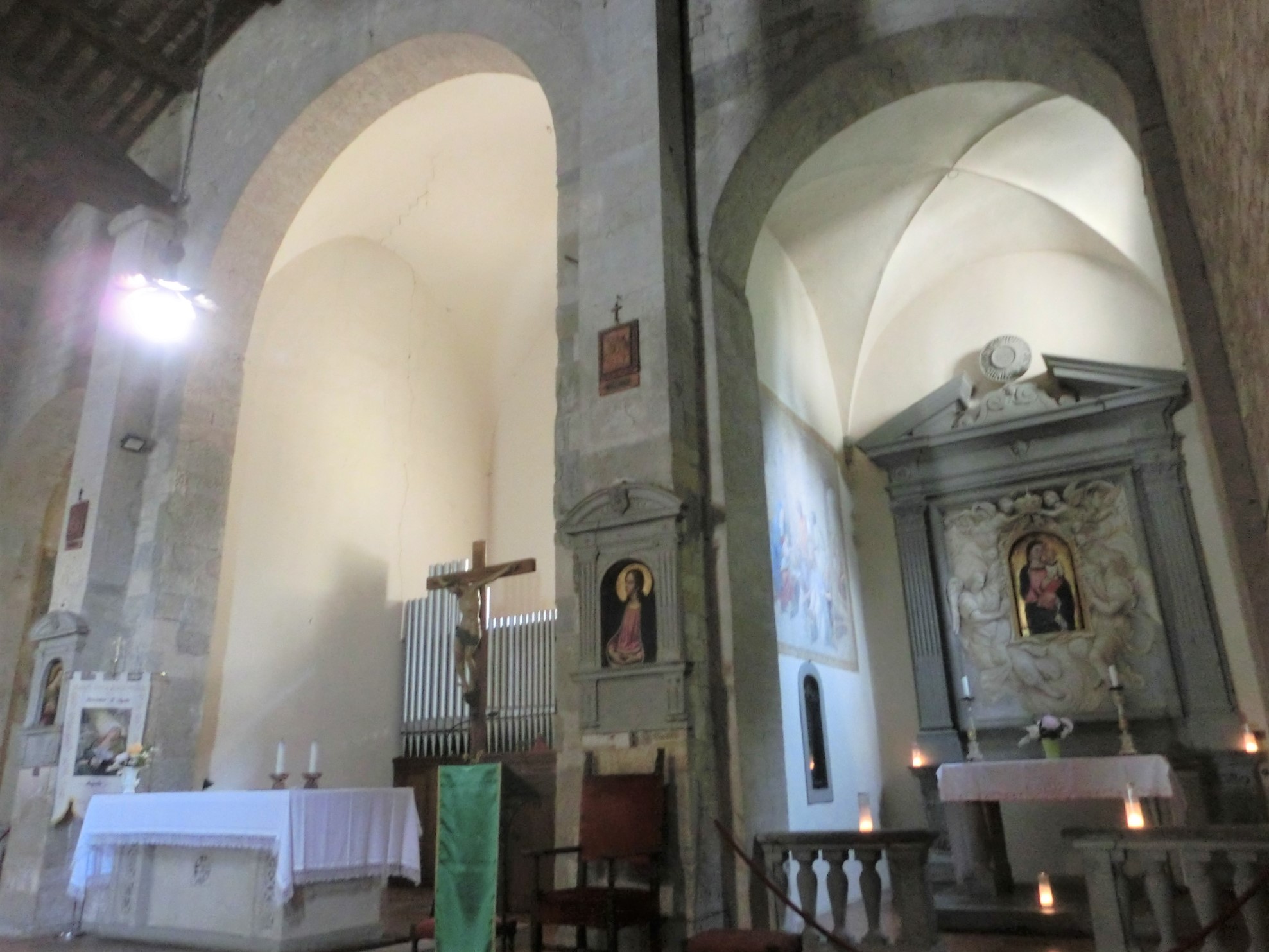 着いてすぐの広場を左斜めに行くと、教会の鐘楼が見えます。教会の正面へは、この鐘楼を左に曲がりましょう。教会は12世紀(洗礼盤の囲いには1175年の表記あり)の建設で、それまでにあった小さな教会を拡張したもの。ムジェッロ地方を代表するロマネスク様式の教会です。鐘楼は1542年の地震で大きな被害を受け、現在に残るのは元々の鐘楼よりもかなり低くなっているそうです。