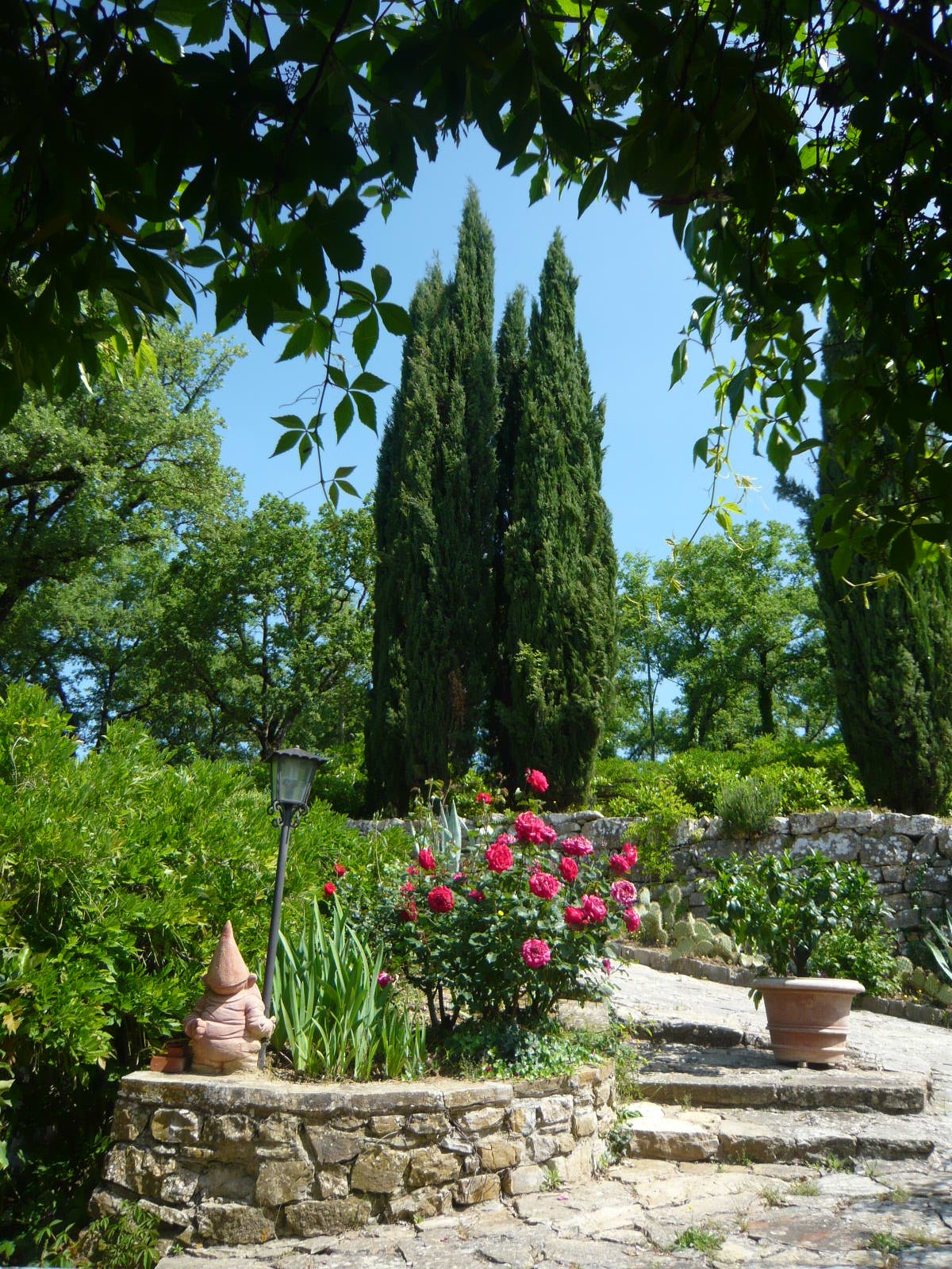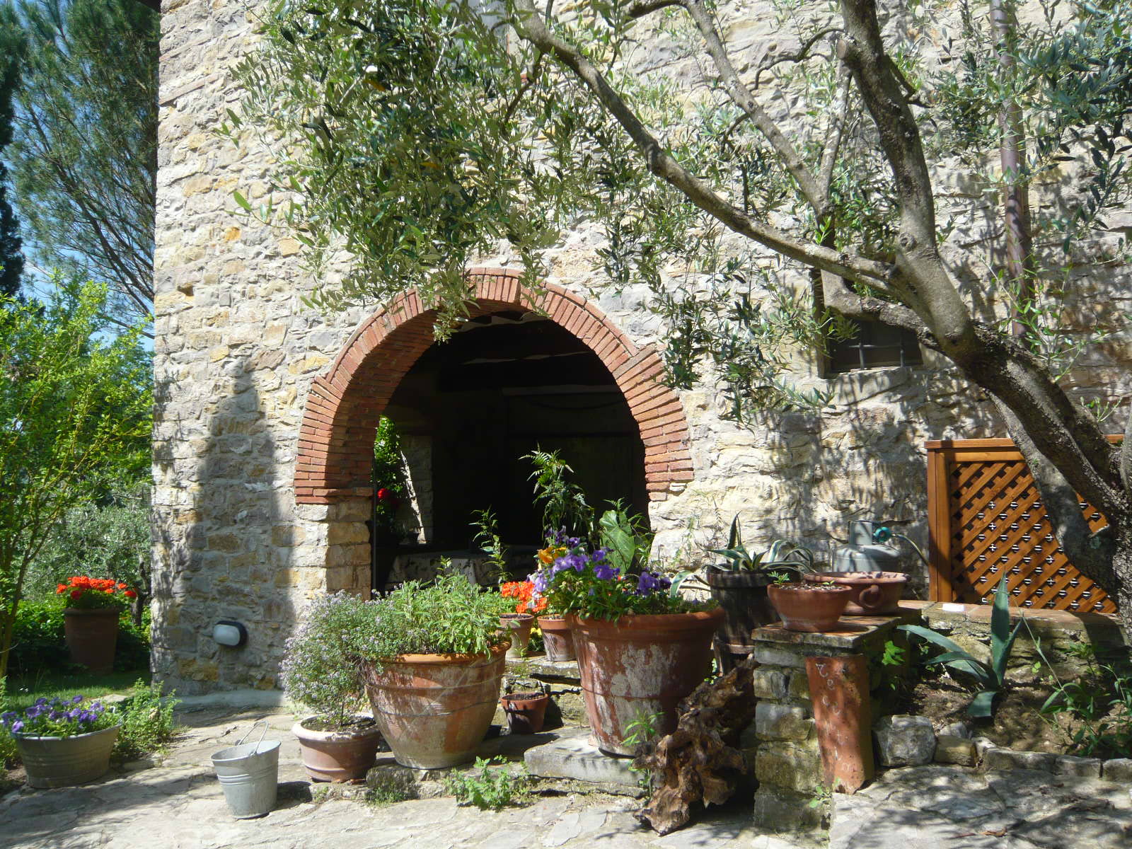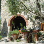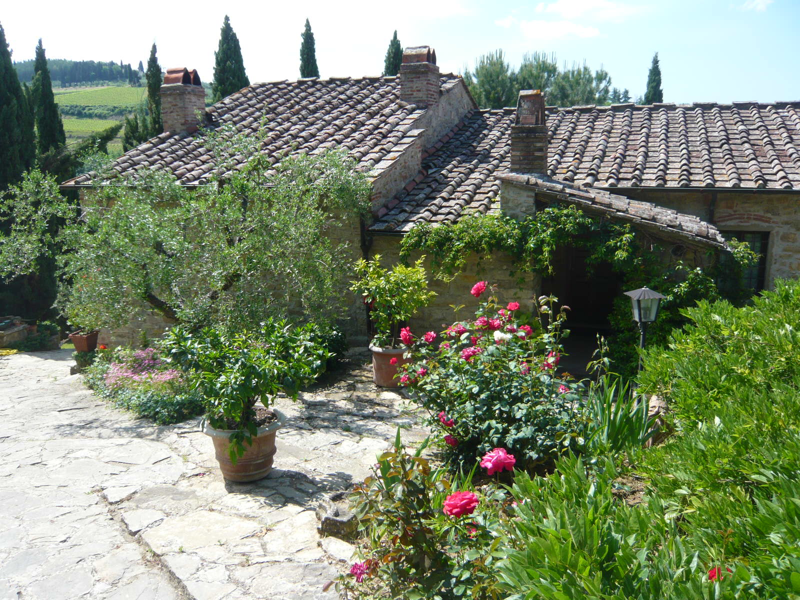 パンツァーノ・イン・キアンティの町を抜けて約2キロ、砂利道のブドウ畑の中を進みながら農家らしき数軒を通り過ぎた後、突き当たりにひっそりと建物が・・・ まさに 隠れ家という言葉がぴったりのB&Bです。 フィレンツェに住んでいたジュリエッタが20年以上前に購入し、雪が降ろうが1人隔離されようが一番落ちつく!と断言する、まさに 彼女の“お城” 。 建物は何十年、いや何百年の間に改築・増築が繰り返され、一言では表せない複雑な形になっています。