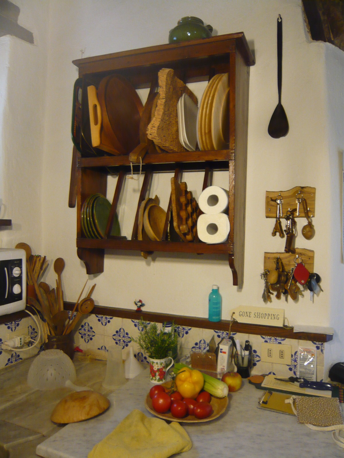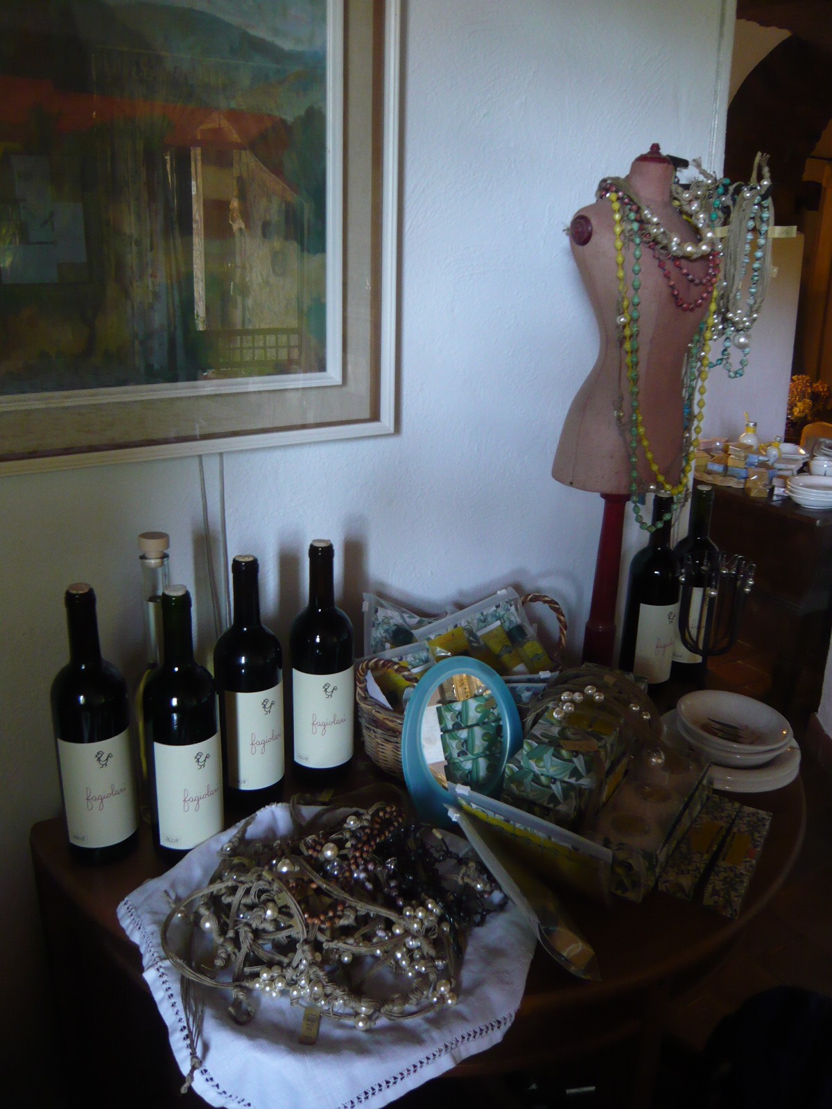 中に入って左側はダイニングルーム、ここで朝食や料理教室後の食事、夕食(オプション)などをして頂けます。とにかく雑貨も可愛くて、このクロスに見えるナイロン製のテーブルクロスは私もお店を聞いて買いに行ったほど。ダイニングの一角などには、自家製のワインやジュリエッタセレクトの陶器や石鹸、アクセサリーがインテリアに溶け込むように配置され、そして購入できるようになっています。