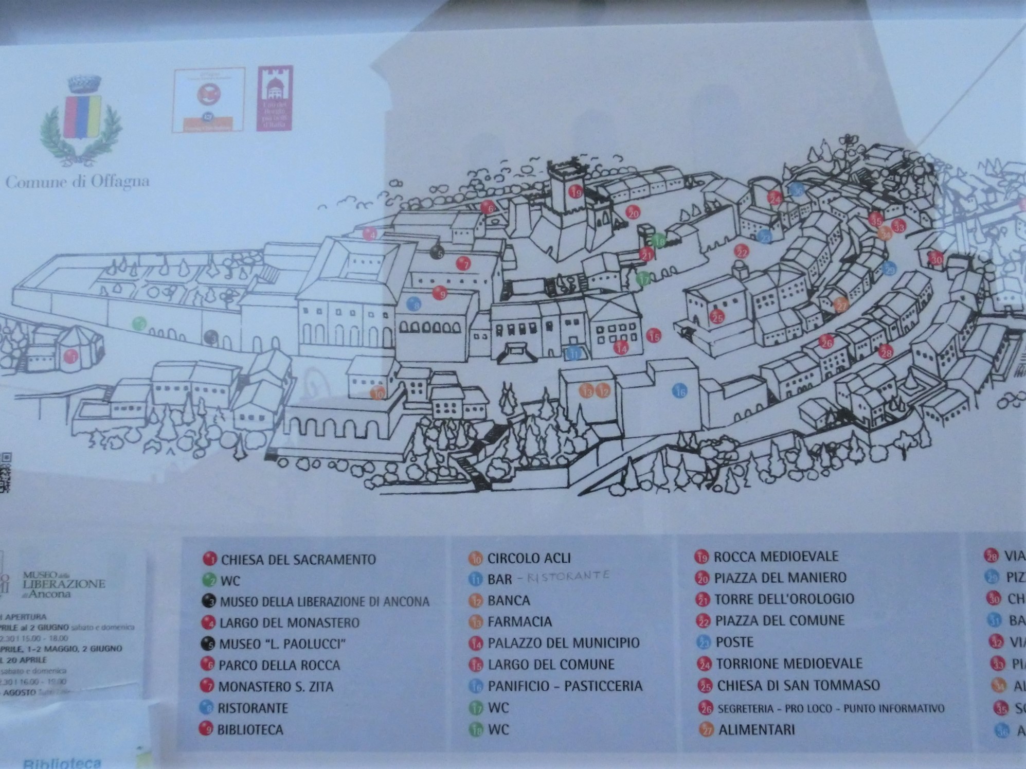 標高309mにある小さな村ですが、その村の大半?を占めるかのような立派な要塞があります。これは旧市街下の広場ですが、ここから「Rocca=要塞」と書かれた表示に従い、坂を上っていきます。この地に城が建設されたのは1000年頃、このエリアを統治していたアフラーニア家によるもので、ここから後にオッファーニャの名がつきます。その後オッファーニャは、12世紀から16世紀までアンコーナとオージモとの領土争いの場となり、最終的には7000フィオリーニ(当時の通貨)でアンコーナが買収。1454年~1456年に、近隣の勢力からの防衛のため、現在の要塞が建設されたのです。