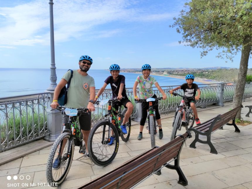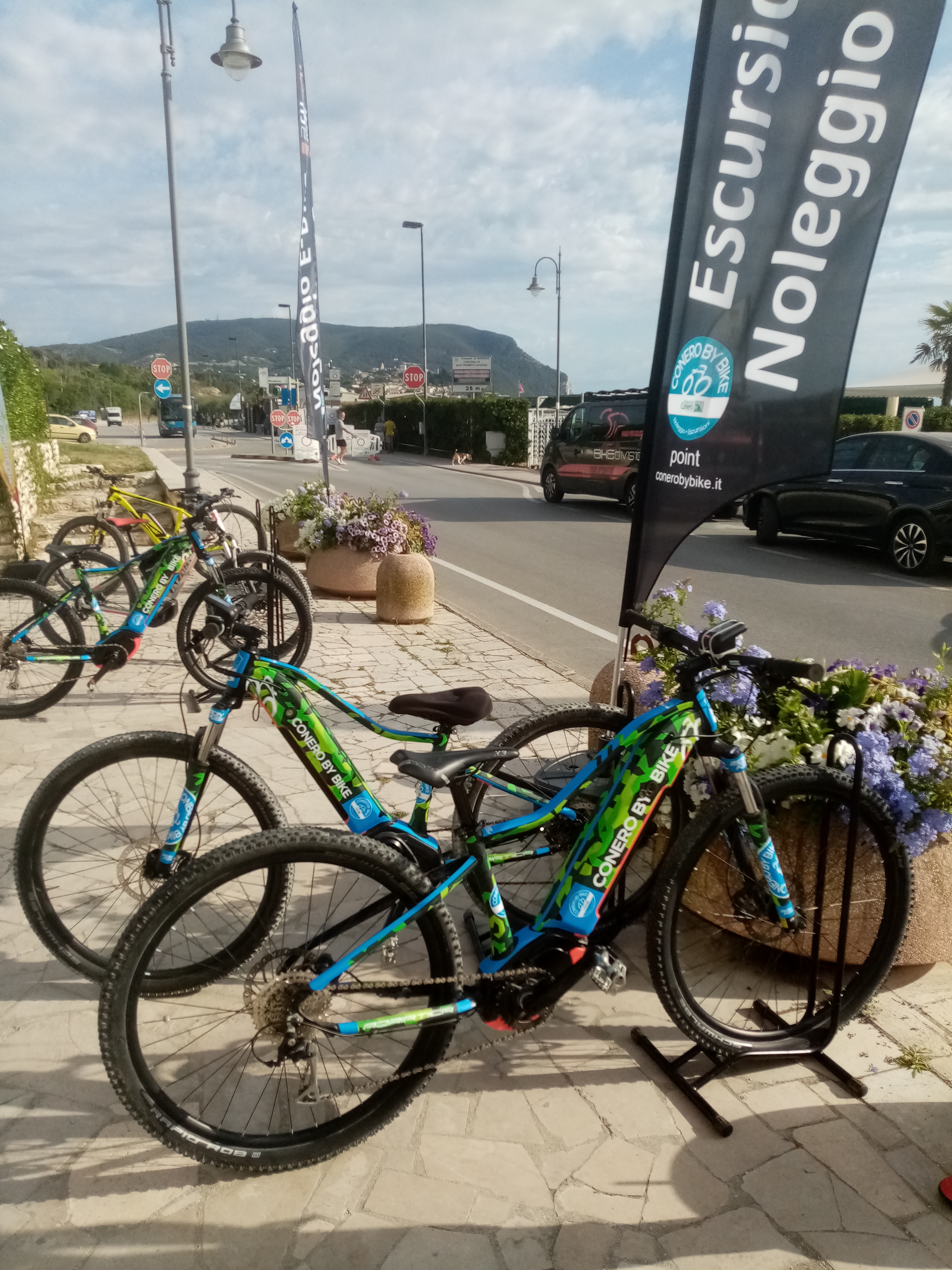 主催はConero by Bike という隣町マルチェッリにあるマウンテンバイクのレンタルとツアーの会社。私たちのほかにもう1家族=小さい娘さんはお父さんの後ろ、9歳の息子さんだったこともあり、、こちらをベースに、ややハードな山下りコースを省き、逆に秘境ビーチのパノラマポイントのポルトヌオーヴォ近くまで足を延ばしたものでした。ガイドは小柄な若い女性のキアーラさん。