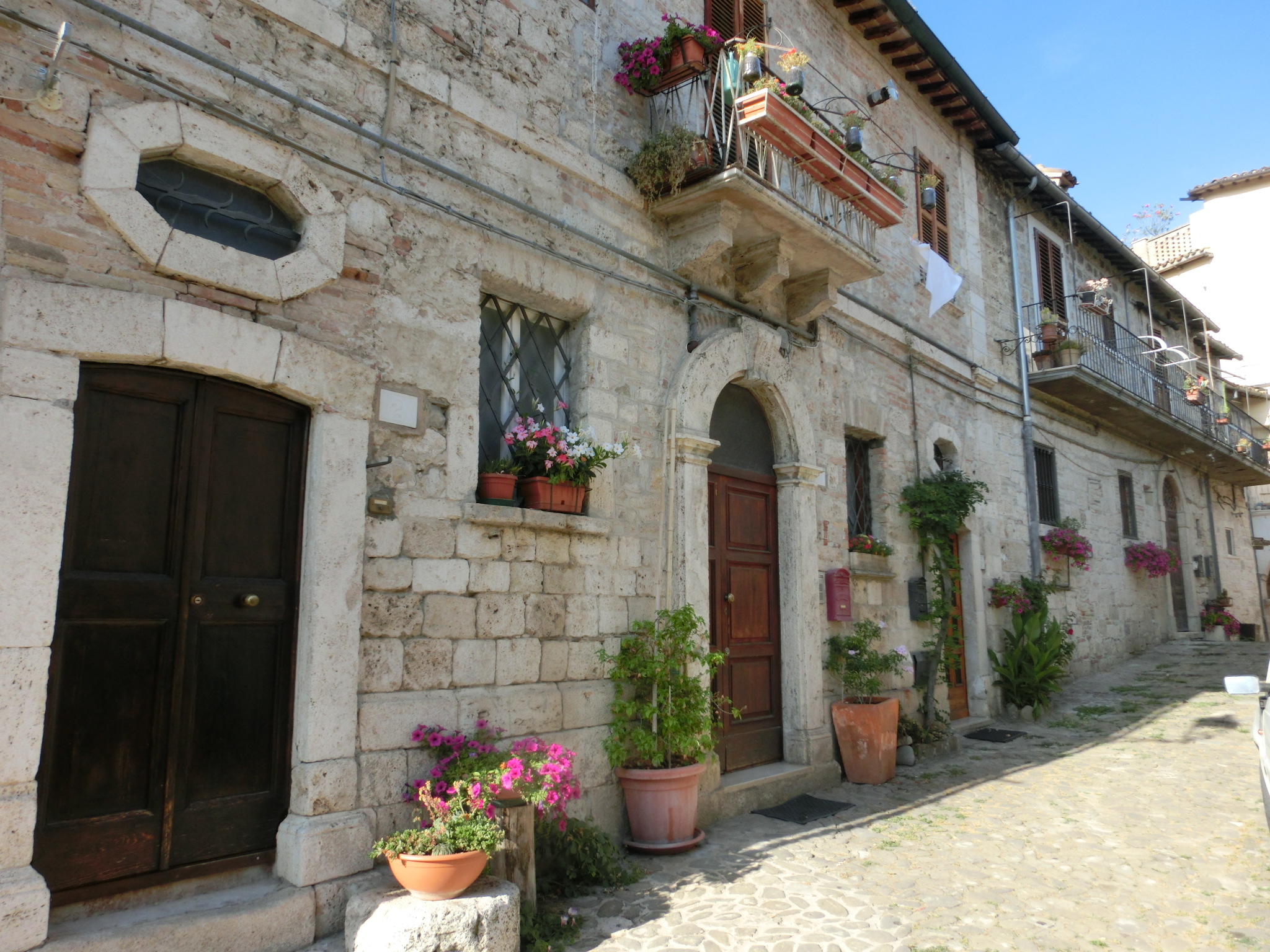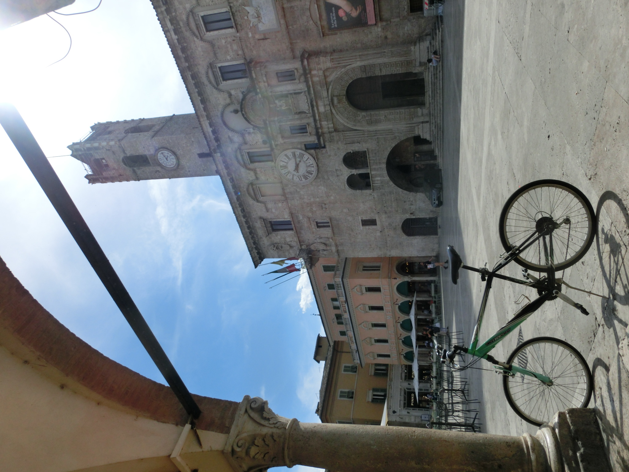 そして奥にあるのが、サン・フランチェスコ教会。この地のフランチェスコ会修道士のために1258年から建設が始まりましたが、完成したのは1549年。写真は右側面で、ファザードは広場ではなくポポロ広場と並行して走るトレヴィオ通りにあります。この教会、個人的に面白かったのが、この前に寄ったトッレ・ディ・パルメで会った友人が教えてくれた伝説。アスコリ町歩きが始まってすぐ、この伝説を確かめに、我が家の男性陣が一斉に注目したのがこの教会の鐘楼なのです・・・というのも