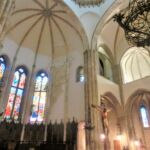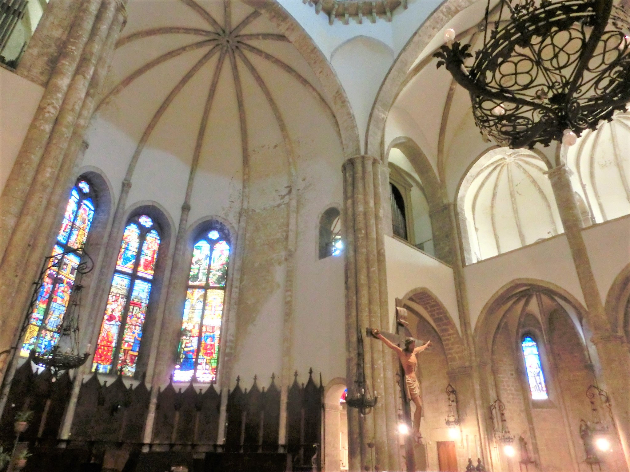 もともとは11世紀にあった教会を、14世紀に拡張して現在の形になりました。内部は青をベースにしたフレスコ画で彩られていますが、これはすべて1800年代に描かれたもの。圧巻は地下礼拝堂で、聖エミーディオの遺品を旧市街へ運ぶべく11世紀に造られたものですが、現在の中央部分は1700年代に改築され、天井を上げ、トラバーチンの柱がヴェローナの赤の大理石の柱に代えられました。後陣のモザイクは1954年に完成した、第二次世界大戦中に激しい抵抗をしたアスコリのパルチザンの物語です。しかし私が一番惹かれたのは、やはりオリジナルのまま残っている左右の柱と天井のフレスコ画でした。ドゥオモにはボランティアのガイドさんがいて、リクエストすれば説明してくれるようです(私は地下礼拝堂でほかのグループの方に説明しているのに混じりました)。