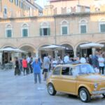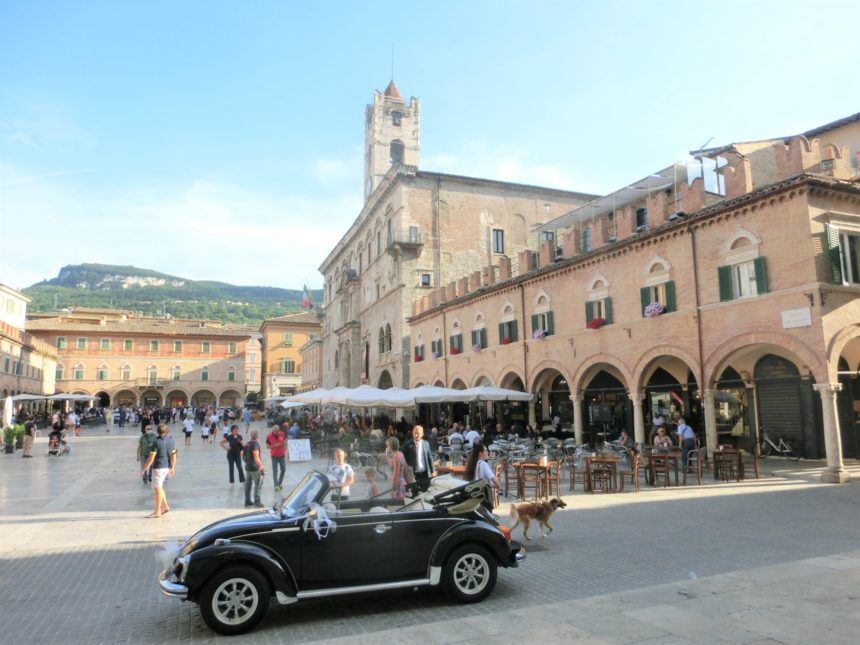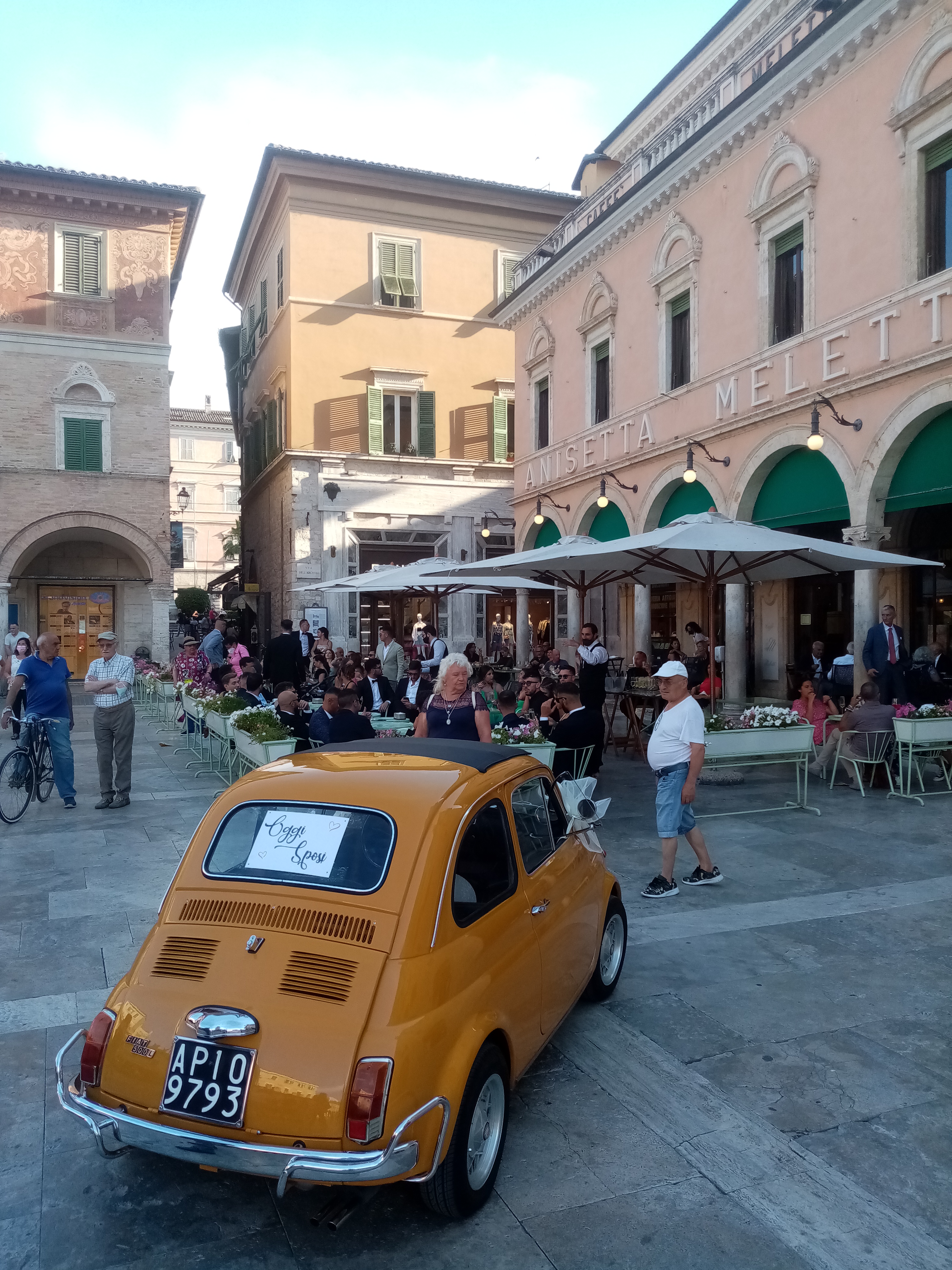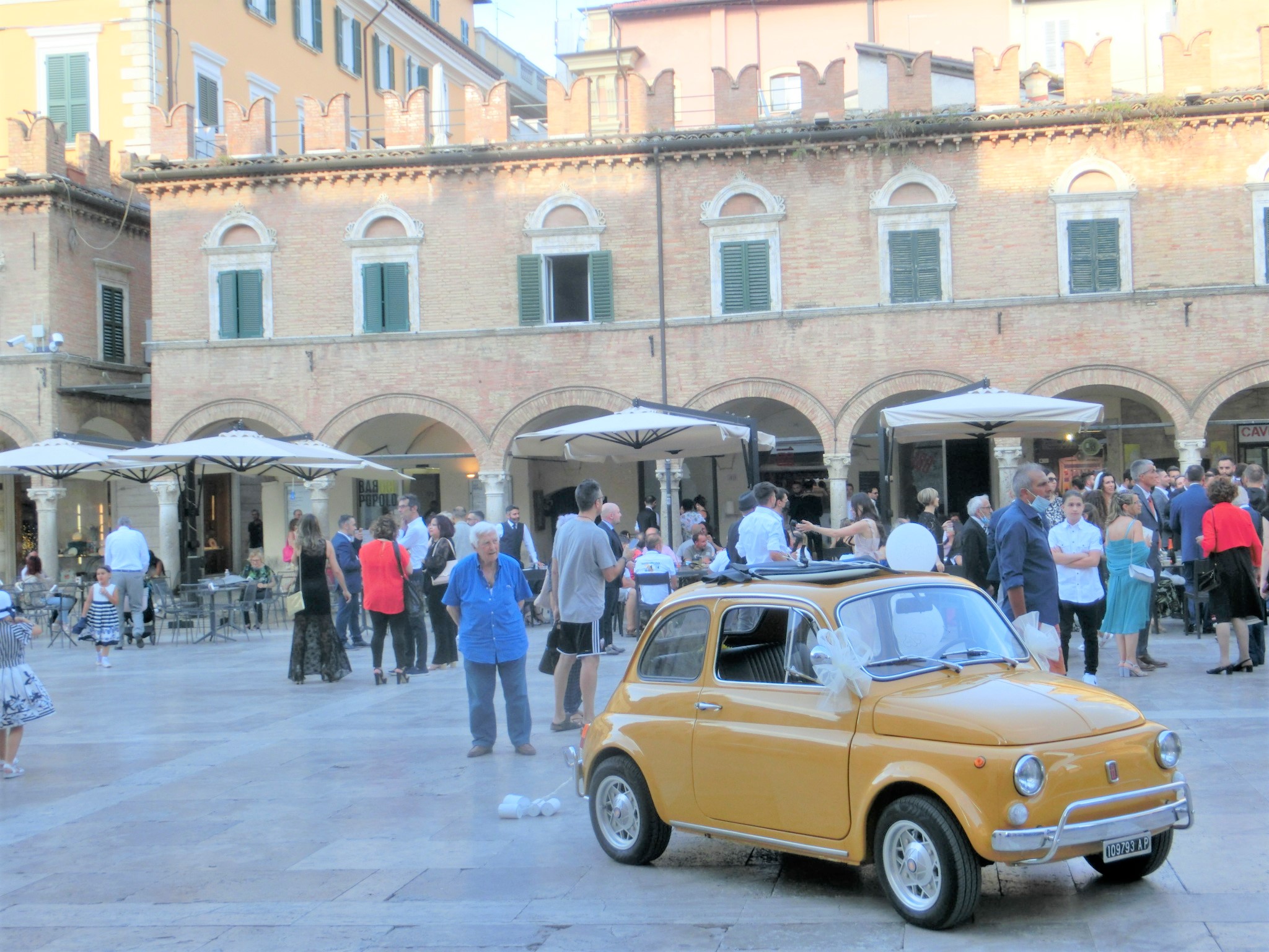1482年から教皇領でもあったからか、前述の2つの教会以外にも、大きな教会がたくさんあることに驚かされます。旧市街は東側に観光スポットや商店が多くありますが、西側は地元民のエリアといった感じで、その西エリアの2つの教会でちょうど結婚式が行われていました。散策の最後にもう一度ポポロ広場に戻った時は、この2組が教会から移動してパーティをやっているのも見ることに。この黒のオープンカー、黄色のチンクエチェントなど、車も可愛らしかった!(下のギャラリーに写真がありますので、イタリア車好きな方はぜひ)