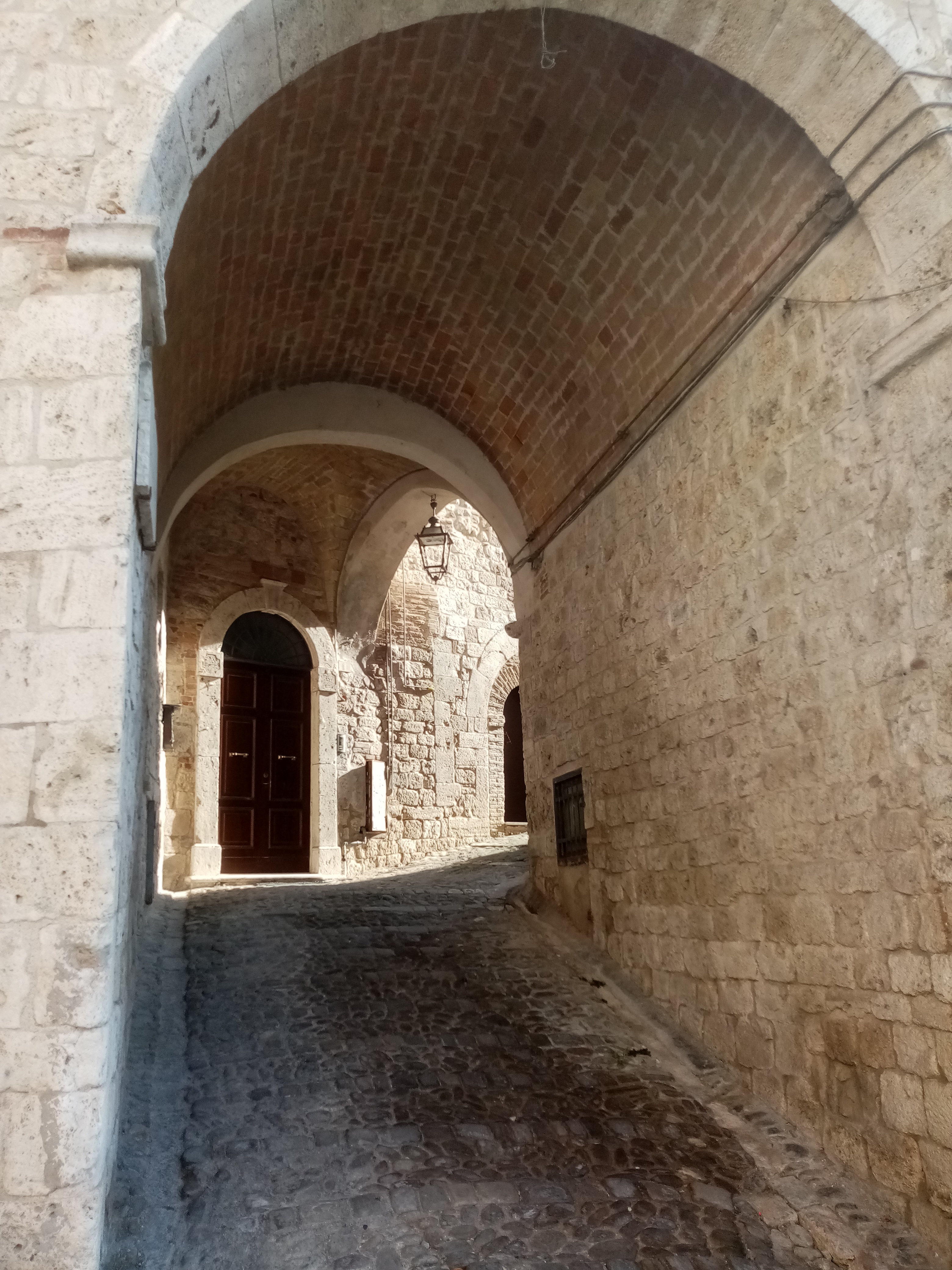 まずは市民隊長の館に入ってみましょう。ローマ時代以前が起源で、長く教皇領であったアスコリ・ピチェーノですが、自由都市の時代もありました。もともとは13世紀に町の職人階級からなる議会の本部で、その後、その長である「隊長」の館に。入ってすぐは美しい中庭で、2階まで上ることもできます。内部は定期的な展示会スペースとなっており、展示会に入場しないと見学はできないようでした。
