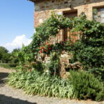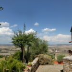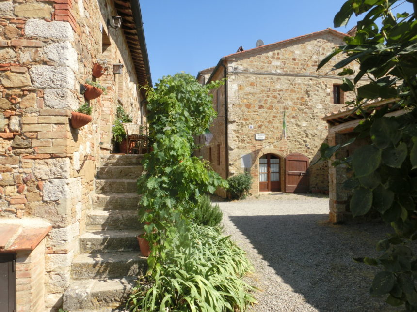 教会の左横の古の門からは、オルチャ渓谷の絶景が。そして再び集落の中に戻っても、中世以降の建物がそのまま残り、鳥やセミの声しか聞こえない静寂の中に身を置くと、なん百年年も前にタイムスリップしたような錯覚におちいります。夏は車でこないと辛いですが、それ以外の気持ちの良い季節はバーニョ・ヴィニョ―ニからプチトレッキングがおススメです。トレッキング愛好者の方は、逆側に抜けてサン・クリーリコ・ドルチャにも行くことができます。集落にお店はないですが、塔の脇にある公共水道は飲用できますので、ここで水分補給してくださいね。