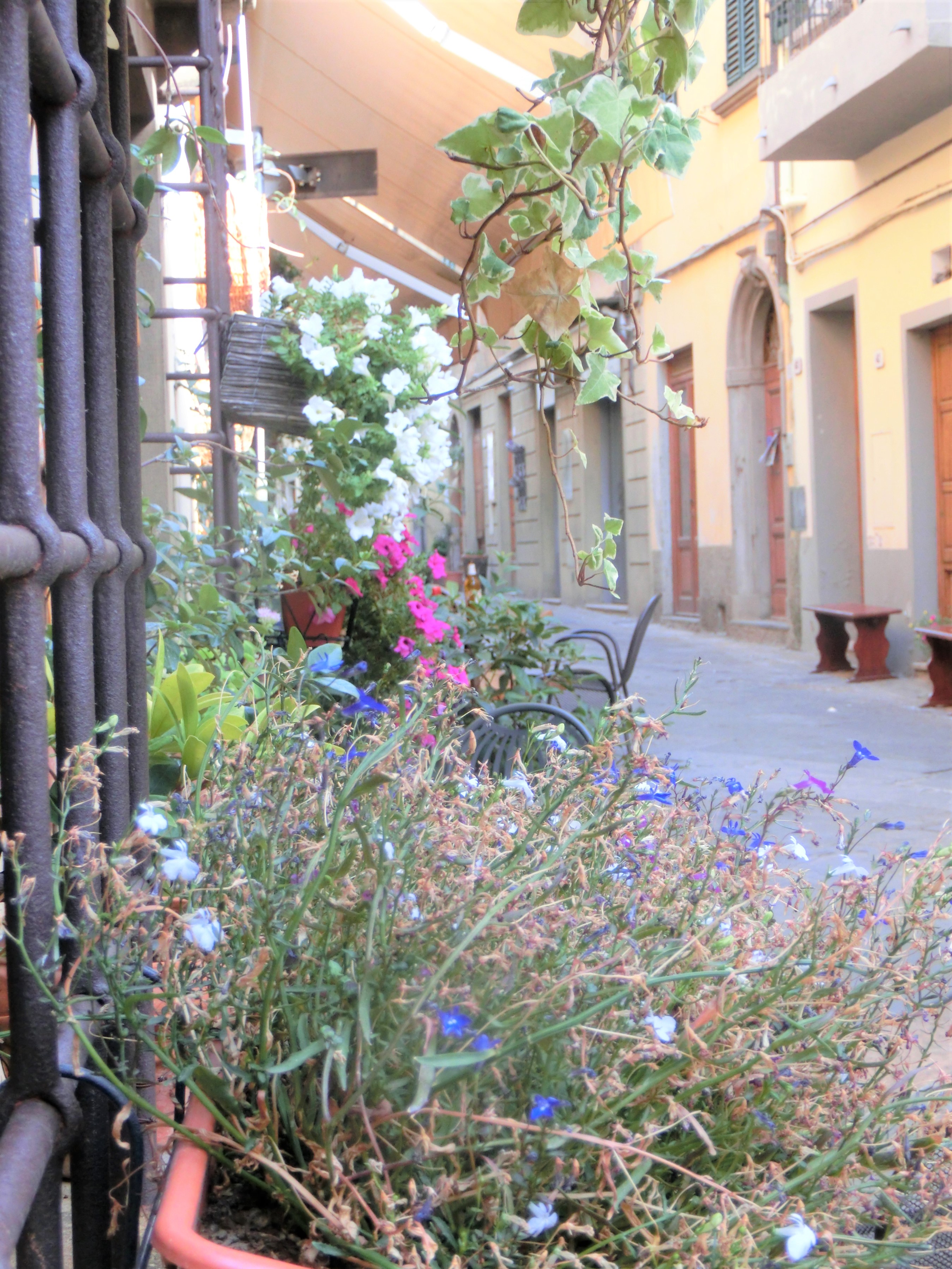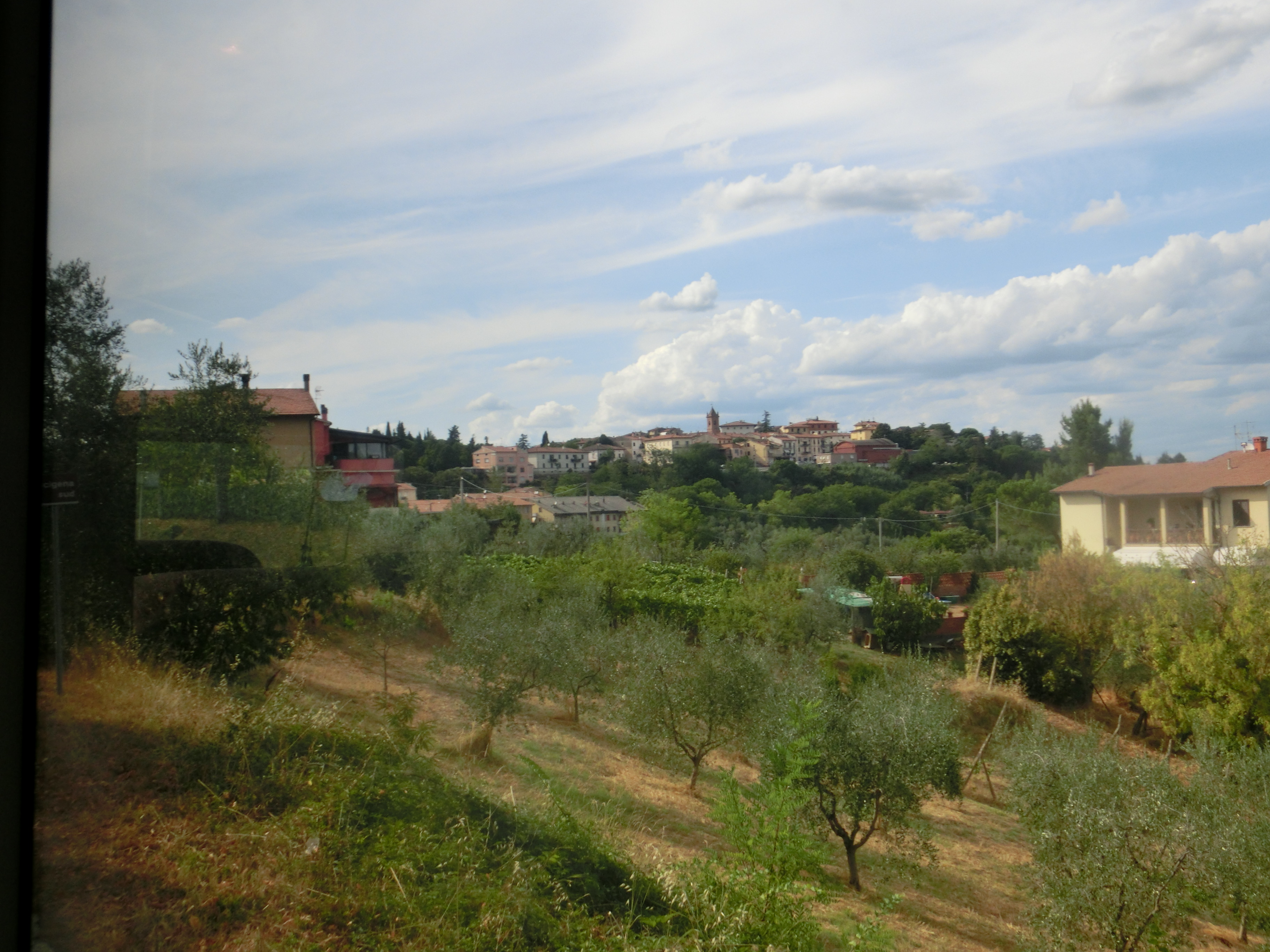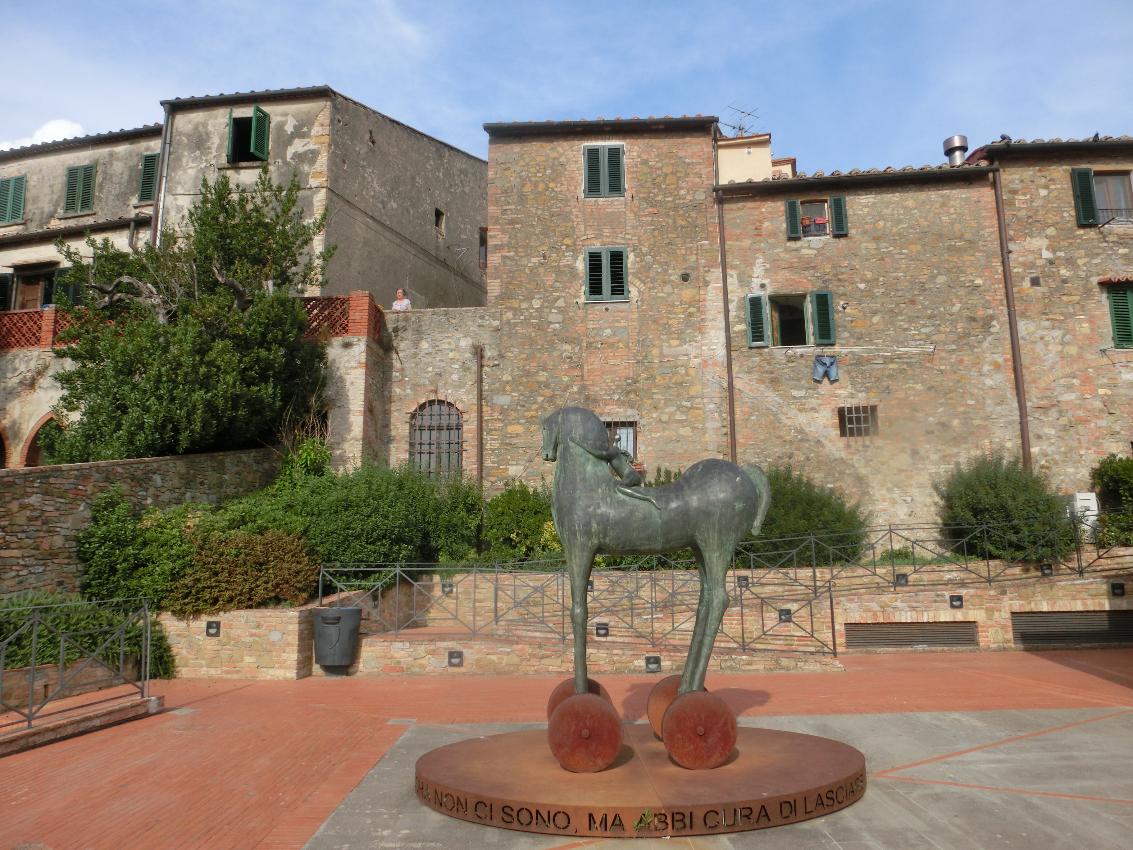 トスカーナの村はかなりの数を訪れていますが、まだまだ未踏の場所も・・・その1つで、行きたかったモンタイオーネ。具体的にどこなのかは知らなかったのですが、8月のトスカーナ自由自在チャンネルのライブ地・チェルタルドから近い!公共交通機関で行ける!ということで、鼻息荒く行ってみました(笑)。最寄り駅はカステルフィオレンティーノ、駅前の角にあるバールでバスチケットを購入し、その前のバス停から直通バスで30分。少しづつ丘を上り、ブドウ畑などトスカーナらしい田園風景を楽しみながらのプチトリップです。終点のバス停は旧市街すぐ外の住宅街なのですが、少し歩くとこんな風景が・・・