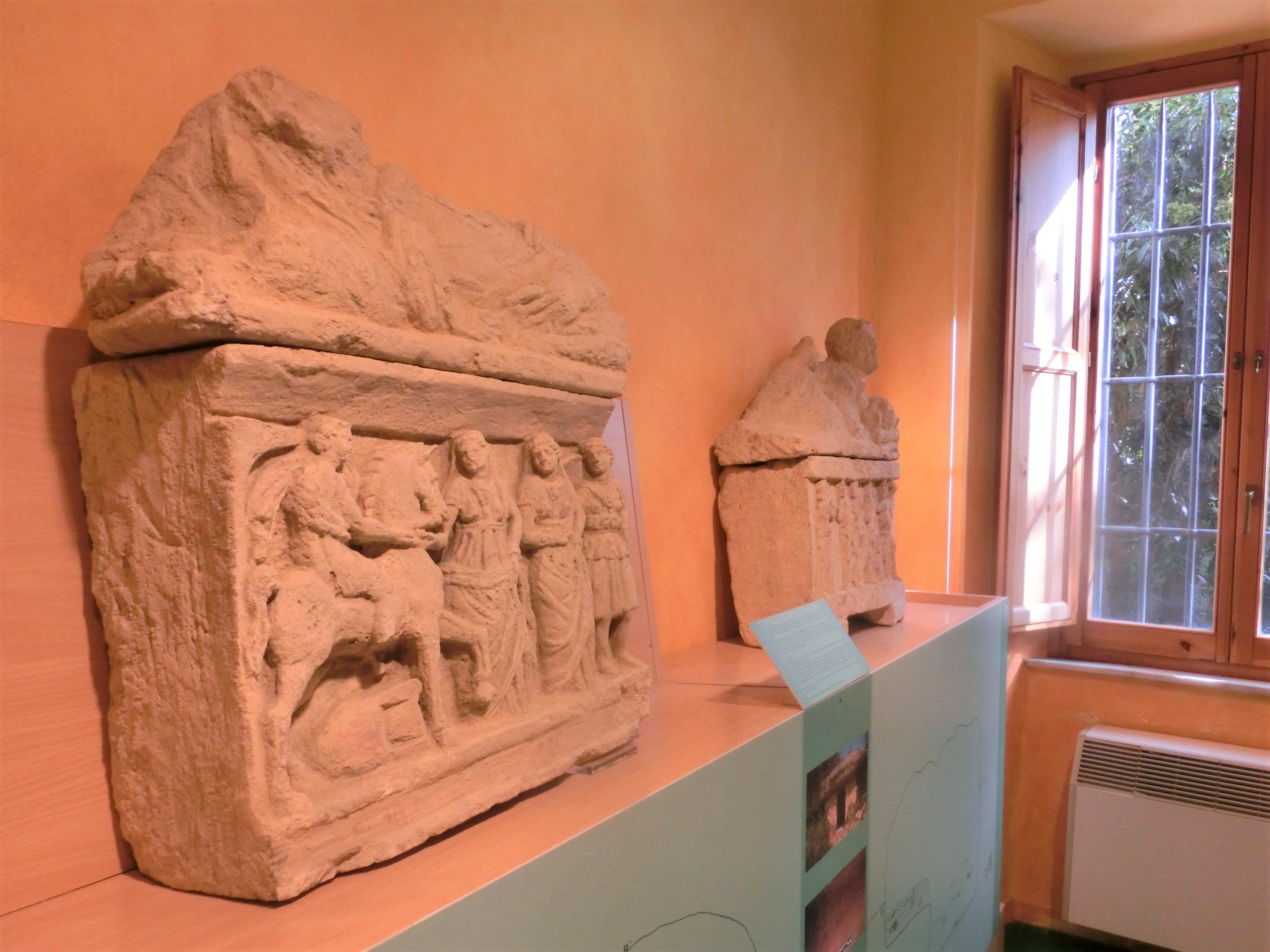 観光案内所になっているのはプレトリオ宮。13世紀頃の建設で、この地を収めていた家族、その後、司法長官などを務めていた家族の家紋が外壁を彩ります。中は観光案内所と、エトルリア時代から集落があったこの地からの出土物などの小さな博物館になっています。観光案内所を訪れる目的は、だいたいどの案内所にもある町の地図。見どころとその説明が簡潔に書いてあるので、事前に調べる時間がなかった時や、訪問する時間も少ない時にはとても便利です。