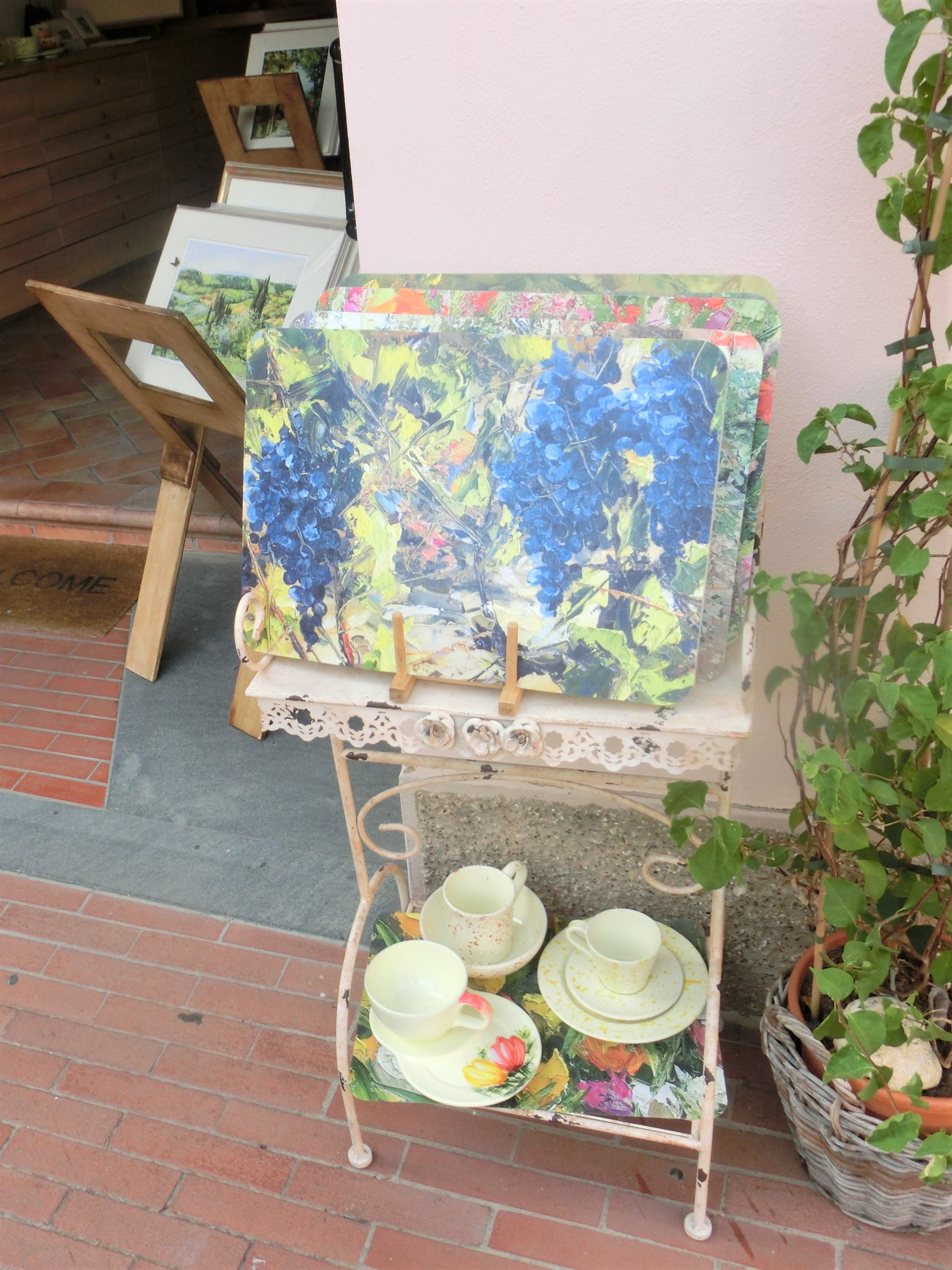 またアンティークのお店、アーチストや職人さんのお店も数軒。一番印象に残ったのは、この車のイラストや、イラストを使ったTシャツなどのガジェットを販売するアトリエです。奥にテーブルライトが光り、一昔前のちょい悪風親父がパソコンに向かっています。作品はきっとデジタルなんでしょうね。