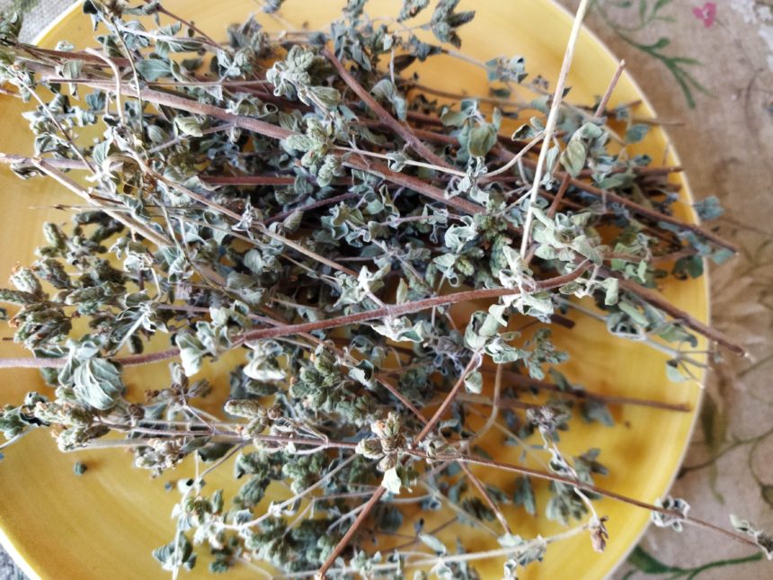 うちの自生オレガノの花は濃い紫だったのですが、こちらはきっと黄色?花の形もちょっと違います。まずは一部、オレガノだけで使うために葉と花をこそぎ落とします。