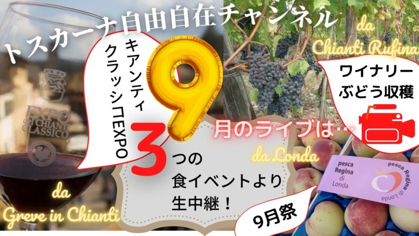 今月は告知が遅くなり、申し訳ありません!9月、秋、秋と言えばグルメ!秋の食祭り会場からライブ!ということで企画を進めていましたが、イベント自体がコロナ禍の影響で例年と違うイレギュラーな形になっていたこともあり、やや手間取ってしまいました。ともあれ、今回はワイン好きなら、いやそうでなくても一度は見たい!ヴェンデミア=ブドウの収穫と、キアンティ・クラッシコの中心、グレーヴェ・イン・キアンティでも市の方に協力いただき、ライブを行えることになりました!日が迫っていますが、ぜひ「いま」のトスカーナの空気をお届けしたいと思います。