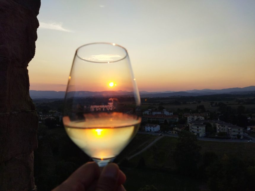 例年なら、屋根に軽食がずらりと並ぶのですが、コロナ禍のためにナッツとスキアッチャータの入った袋が各自に配られ、プロセッコか赤ワインのグラスを持って外で絶景を楽しみながら乾杯!いやぁぁ最高です。イタリア長期在住者の私たち4人でも感動し、「これは毎年恒例やね★」というほどなので、日本から来ていただいたら、もう感涙しちゃうかもしれません。