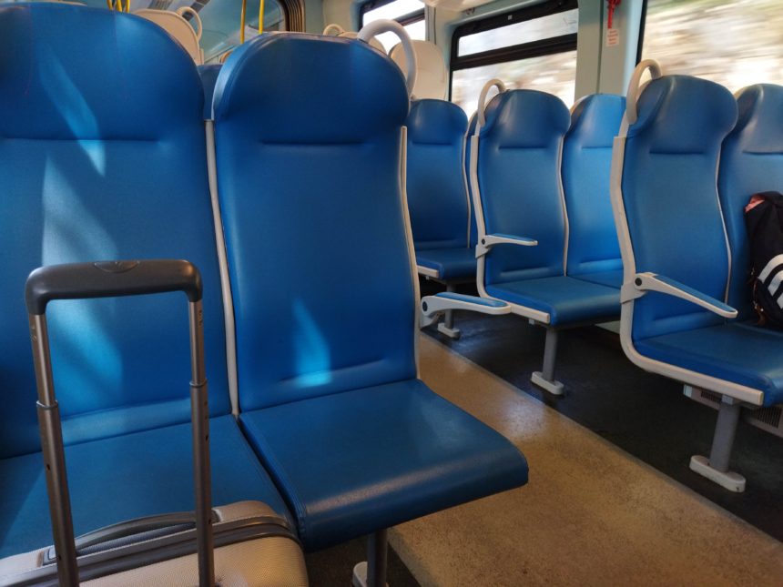 TOP写真の車両・車内はプーリア州以外の鈍行と同じ青基調でしたが、一部の路線で赤基調のものがありました。そしてイスの厚みがない&足が細い(笑)、席の列ごとにごみ箱や電源がないのも他の州と違うところです(電源がない古い車両、あってもONになってないことはトスカーナでもあります)。あと細かいですが、窓にブラインドがなくてめっちゃ眩しくて反対側のイスに変わりました。