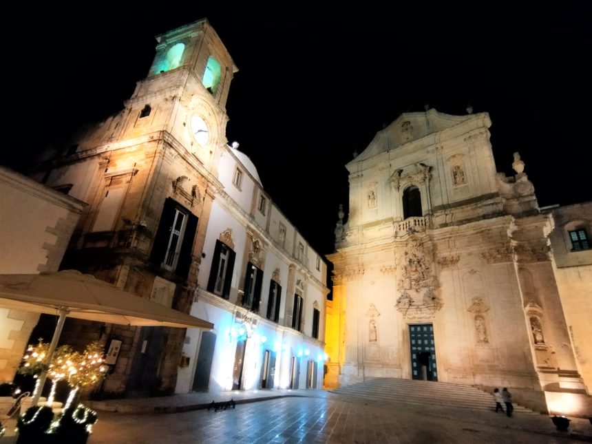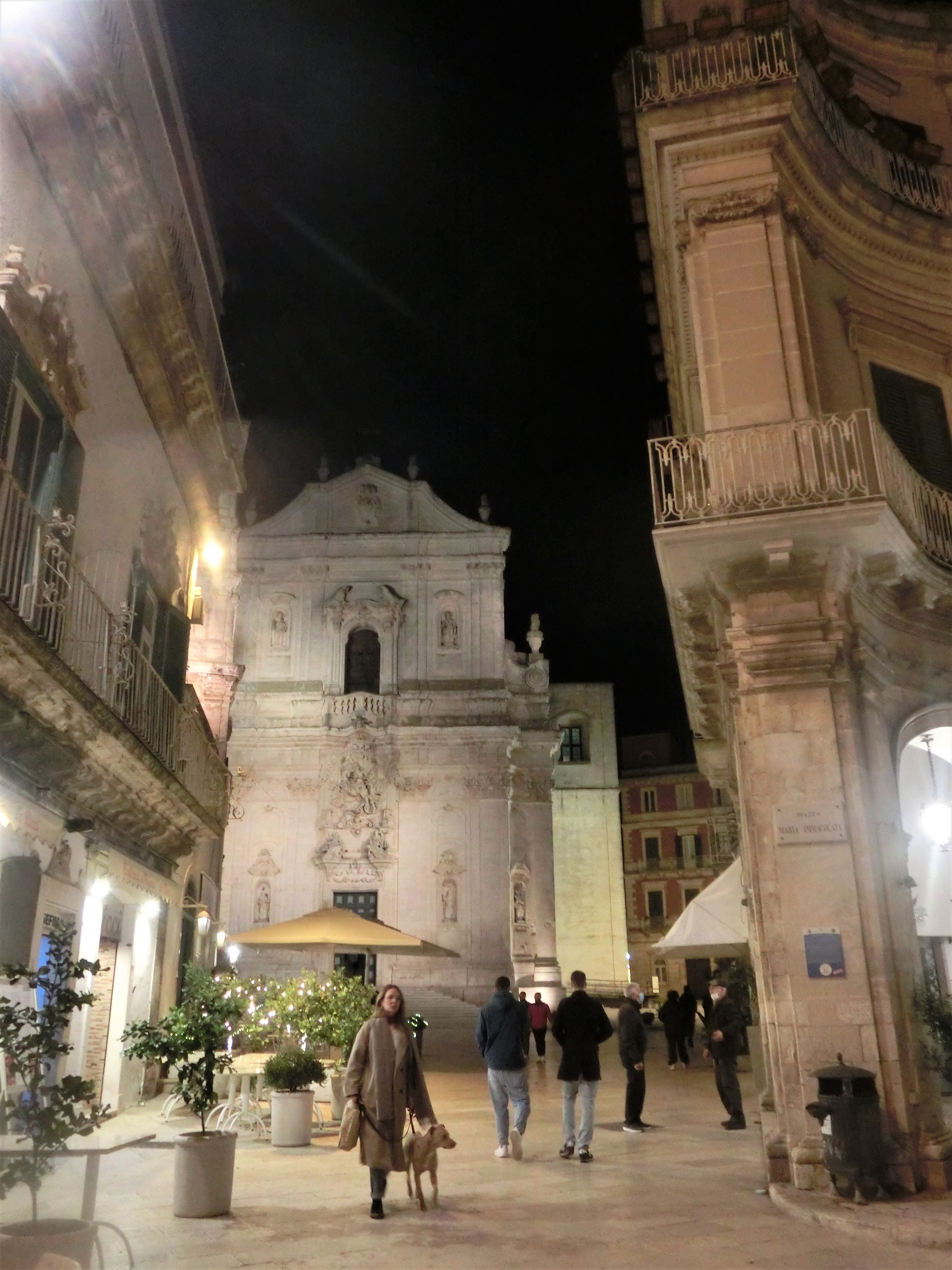 ゆるやかなカーブを描く柱廊付きの建物が目印の、マリア・インマコラータ広場。そしてその奥にはサン・マルティーノ大聖堂があるプレビシート広場へと続いている。暗闇に浮かあがるバロック様式の建物の美しさ、そしてこの奥行とちょい見せがたまりません。