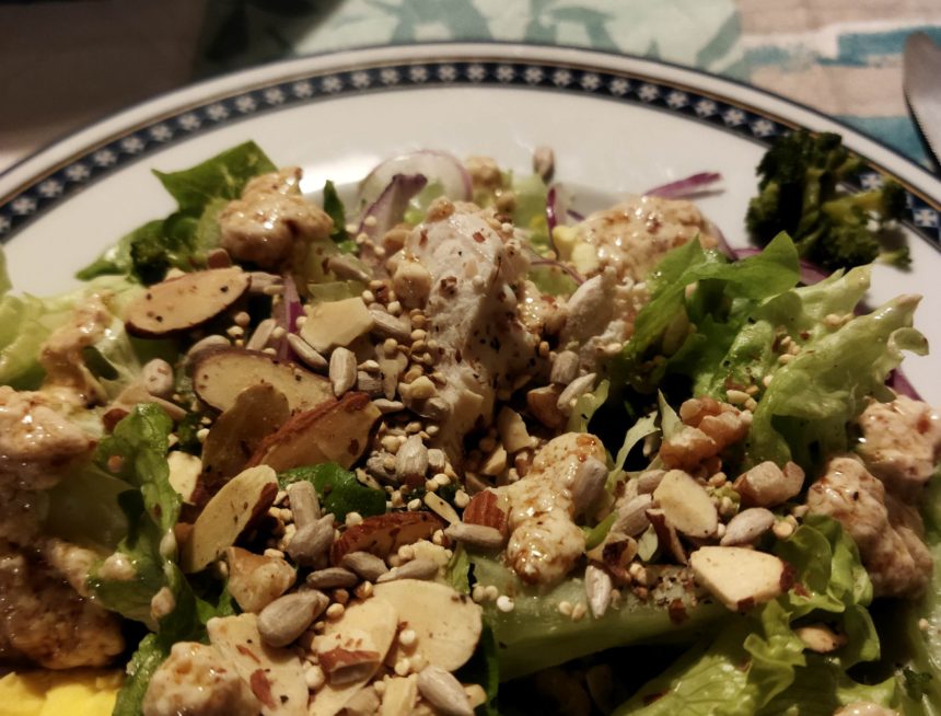サラダは、鶏の胸肉、茹で卵、ツナなどのタンパク質に、今はブロッコリーなども入れて。イタリアのサラダは普通、オリーブオイルとビネガーに塩というさっぱりな味付けなので、ボリュームサラダの場合はドレッシングで楽しむようにしています。大ヒットがこちら、ゴマヨーグルトなんですが、ダンナの好物であるニンニクもたっぷりと。