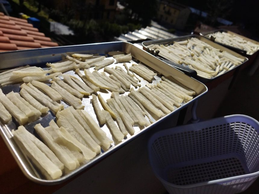 日本に帰省できなくなって2年半。いつもは向こう1年分の食材を爆買いして帰ってくるのですが、それももうとおに底をつき・・・日本と比べるととんでもなく高いのですが、フィレンツェのアジア系食材店や最近はミラノ本社のオンラインショップで購入したりしています。しかし、よく使うのにイタリアでは存在しない食材も。そのうちの1つが、「切り干し大根」。大根自体は近年、普通のスーパーでも売っているくらい普及しているのですが、切り干し大根はありません。大根でいいやん?と思いきや、うちには大根よりも「切り干し大根」が大好きな高校生が1人・・・長男の日本食材の好物は「レンコン、しいたけ、麩、切り干し大根」とジジィみたい。きゅうりも大好物ですが冬に和食をするときの副菜が何もないので、一念発起、切り干し大根を自作することにしたのです。