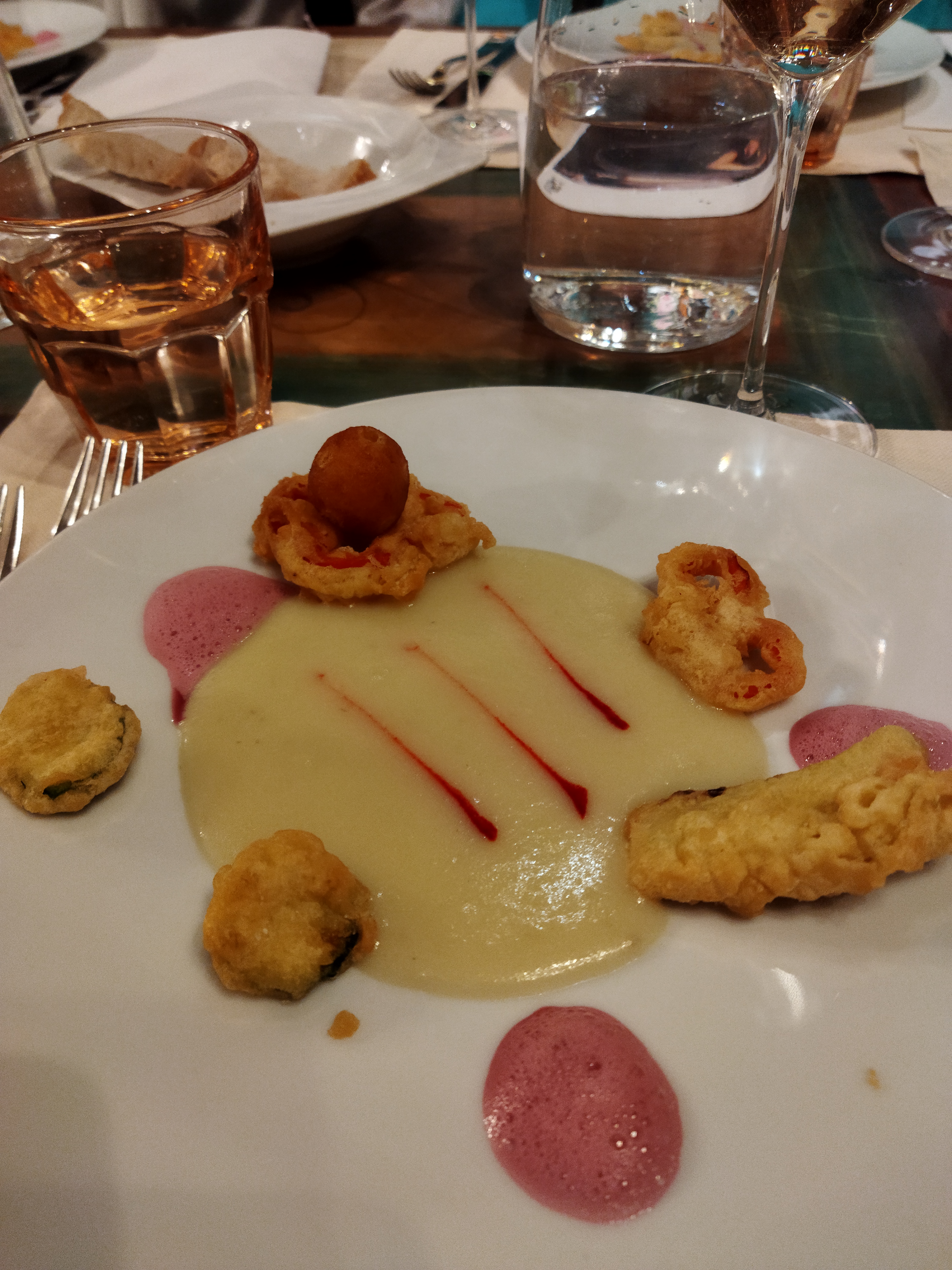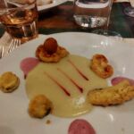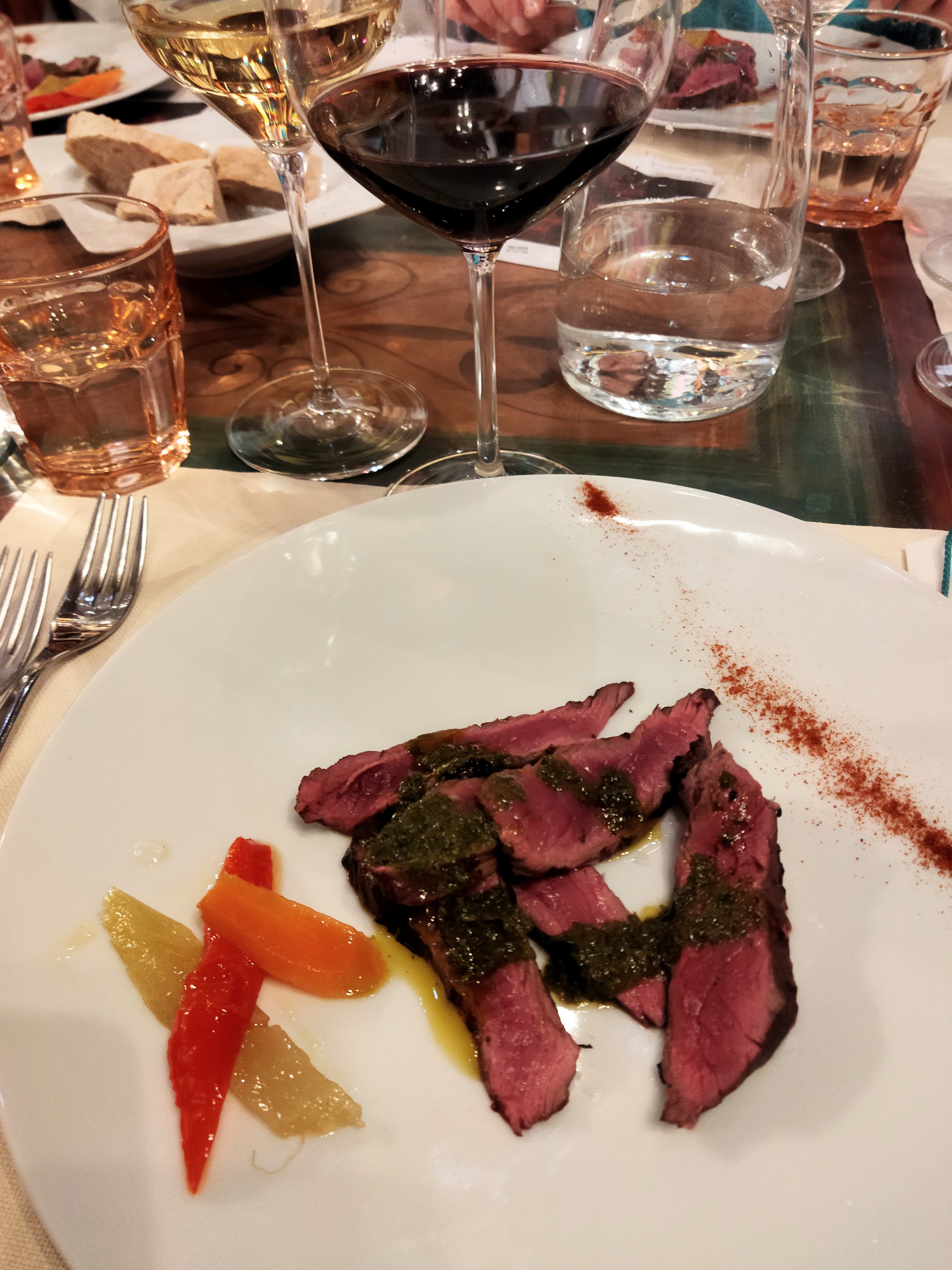 プリモの絵画はTOP写真の・・・言わずもがな!フィレンツェのシンボル、いやイタリアのシンボル的な絵画であるサンドロ・ボッティチェッリの「ヴィーナスの誕生」、合わせたワインはサン・ジミニャーノの白ワイン・ヴェルナッチャ。私はワインにそれほど詳しくないのと、おしゃべりの方に気がいってワインの感想はあまり書けないのですが、このトルテッリは美味しかった!!中の具はリコッタチーズに野生のフェンネル、ソースはシエナの高級豚チンタ・セネーゼのホワイトラグー(トマトなしのミートソース)。このソースが味濃い目&フェンネルシードが効いており、ワインもどんどん進みます・・・といっても1杯の量は決まっているし、私はそれほど強くないので、ここからはワインはやや自粛。でないとあと2皿楽しめない~!