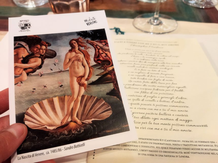 スタート、というのも、自由に料理を選ぶのではなく、企画ものの夕食だったから開始時間が決まっていました。「料理×ワイン×絵画」のマリアージュで、これまたなんとイタリアらしい、芸術の町フィレンツェらしい企画です。しかも女性の日にちなみ、絵画の主役は全て女性!