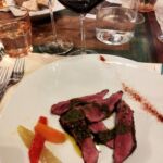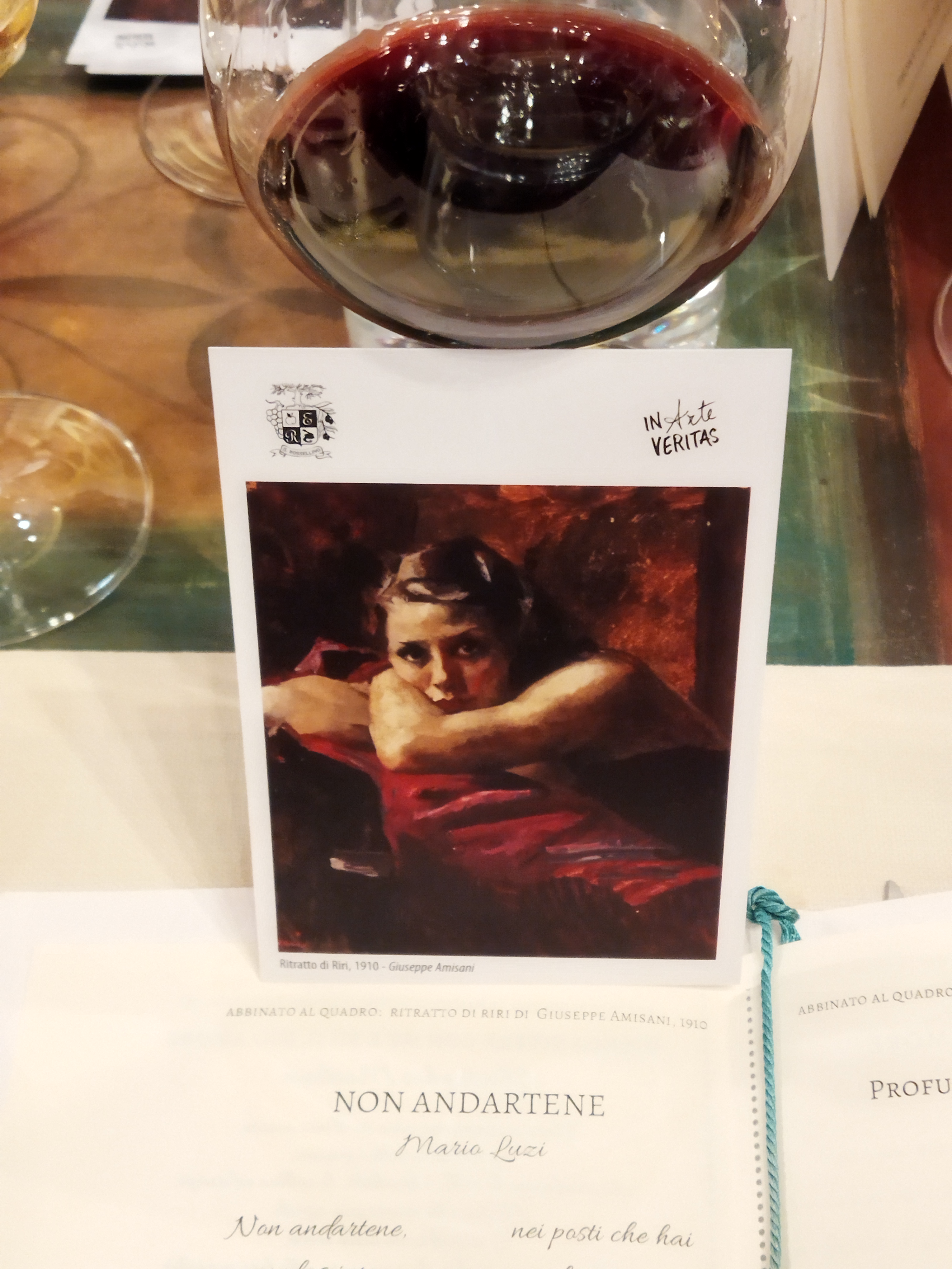 3皿目は仔牛のタリアータ(薄切りステーキ)ですが、初めて一緒に食べたバジルのソースと好相性。ワインはモリーゼの赤ワインティンティリア(モリーゼ州のワインは初めてかも!)、絵画はジュゼッペ・アミザーニの1910年の作品「リ―リの肖像」。